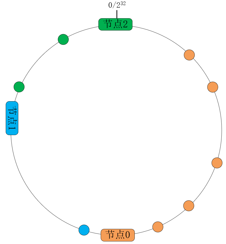 - 首先,将关键字经由通用的哈希函数映射为32位整型哈希值。这些哈希值会形成1个环,最大的数字 ${2^{32}}$ 相当于0。