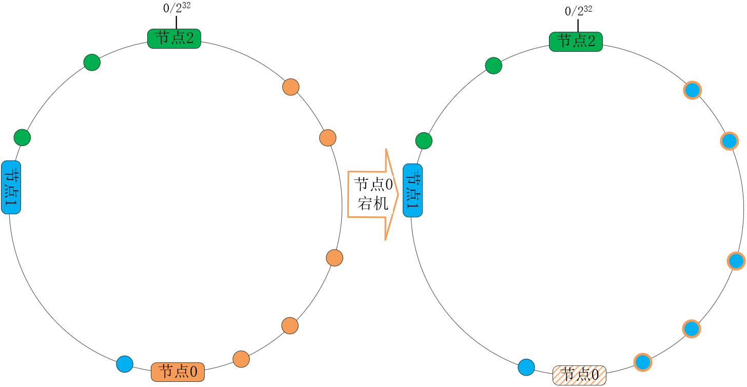 这样,如果图中绿色的节点0宕机,按照哈希环上数据的迁移规则,8个绿色虚拟节点上的数据就会沿着顺时针方向,分别迁移至相邻的虚拟节点上,最终会迁移到真实节点1(橙色)、节点2(蓝色)、节点3(水红色)上。所以,宕机节点上的数据会迁移到其他所有节点上。