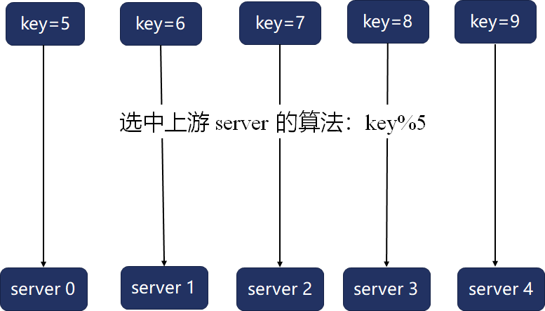 在主机硬件达到性能瓶颈后,有状态服务可以沿AKF立方体Z轴(参见[[第21讲]]),基于哈希算法扩展为分布式系统。下图系统中拥有5个节点,哈希算法将每条数据的关键字模5得出的数字作为哈希桶序号,从而将数据映射到节点上(如果关键字是字符串或者其他结构化数据,可以先通过其他哈希算法转换为整数,再进行模运算):