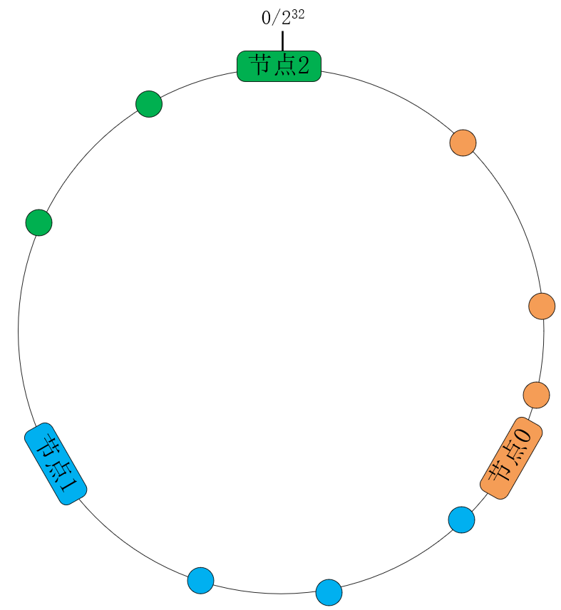 - 其次,设集群节点数为N,将哈希环由小至大分成N段,每个主机节点处理哈希值落在该段内的数据。比如下图中,当节点数N等于3且均匀地分段时,节点0处理哈希值在 [0, $\frac{1}{3} * {2^{32}}$] 范围内的关键字,节点1处理 [$\frac{1}{3} * {2^{32}}$, $\frac{2}{3} * {2^{32}}$] 范围内的关键字,而节点2则处理的范围是 [$\frac{2}{3} * {2^{32}}$, ${2^{32}}$]: