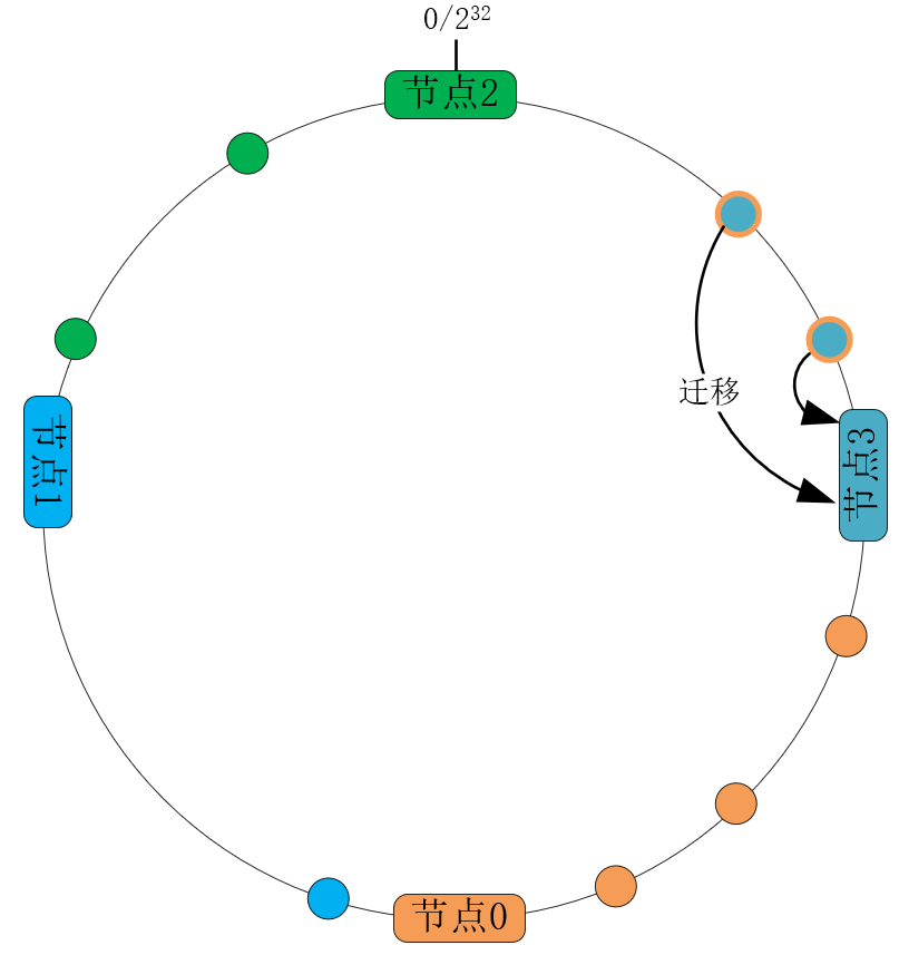 而扩容、缩容时,虽然节点数发生了变化,但只要小幅度调整环上各节点的位置,就不会导致大量数据的迁移。比如下图中我们将3个节点的集群扩容为4个节点,只需要将节点0上一半的数据迁移至节点3即可,其他节点不受影响: