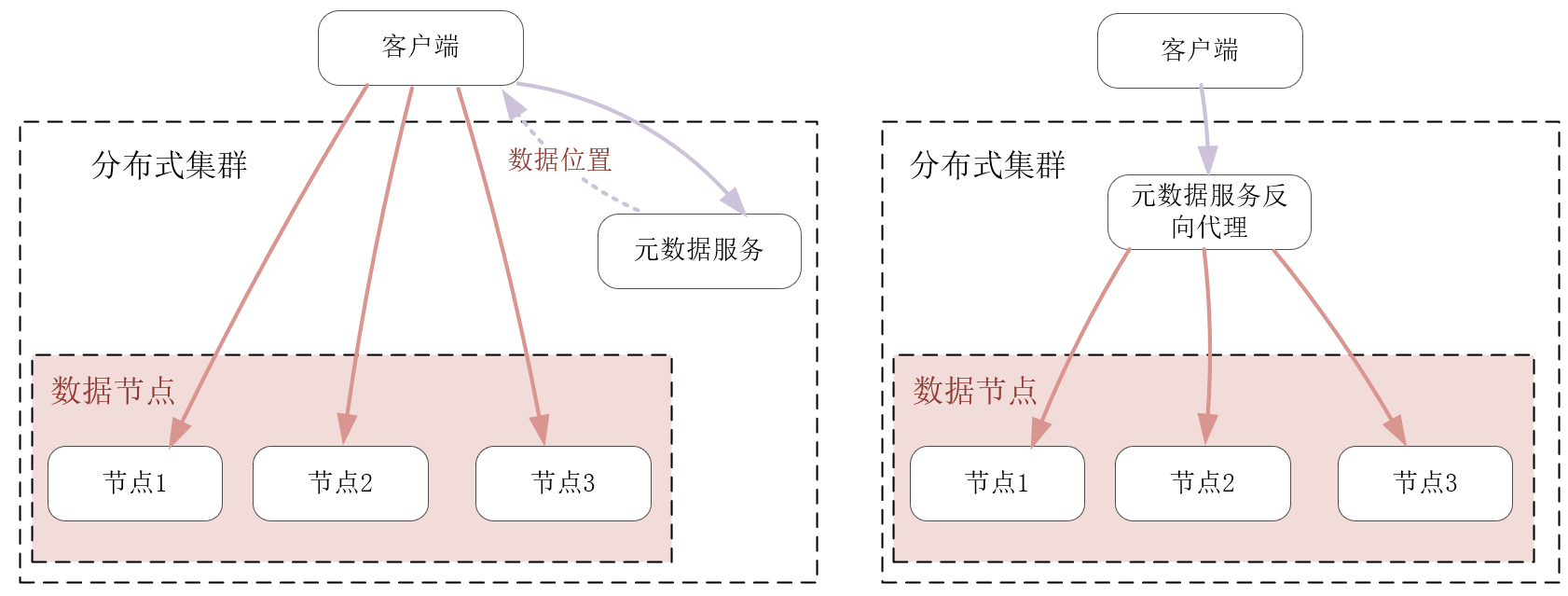最后,留给你一道思考题。提升数据分布、访问的平衡性,并不是只有一致性哈希这一个方案。比如,我们将数据与节点的映射关系放在另一个服务中持久化存储,通过反向代理或者客户端SDK,在访问数据节点前,先从元数据服务中获取到数据的映射关系,再访问对应的节点,也是可以的,如下图所示: