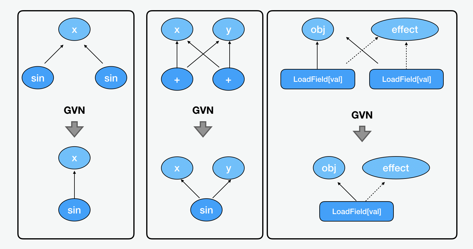 在去重计算中,最常见的是值编号(value numbering)。意思就是在系统里把等于相同的值赋予同一个编号。比如当sin、加法以及LoadField的运算的结果值是一样的时候,那么就只记录一次即可。