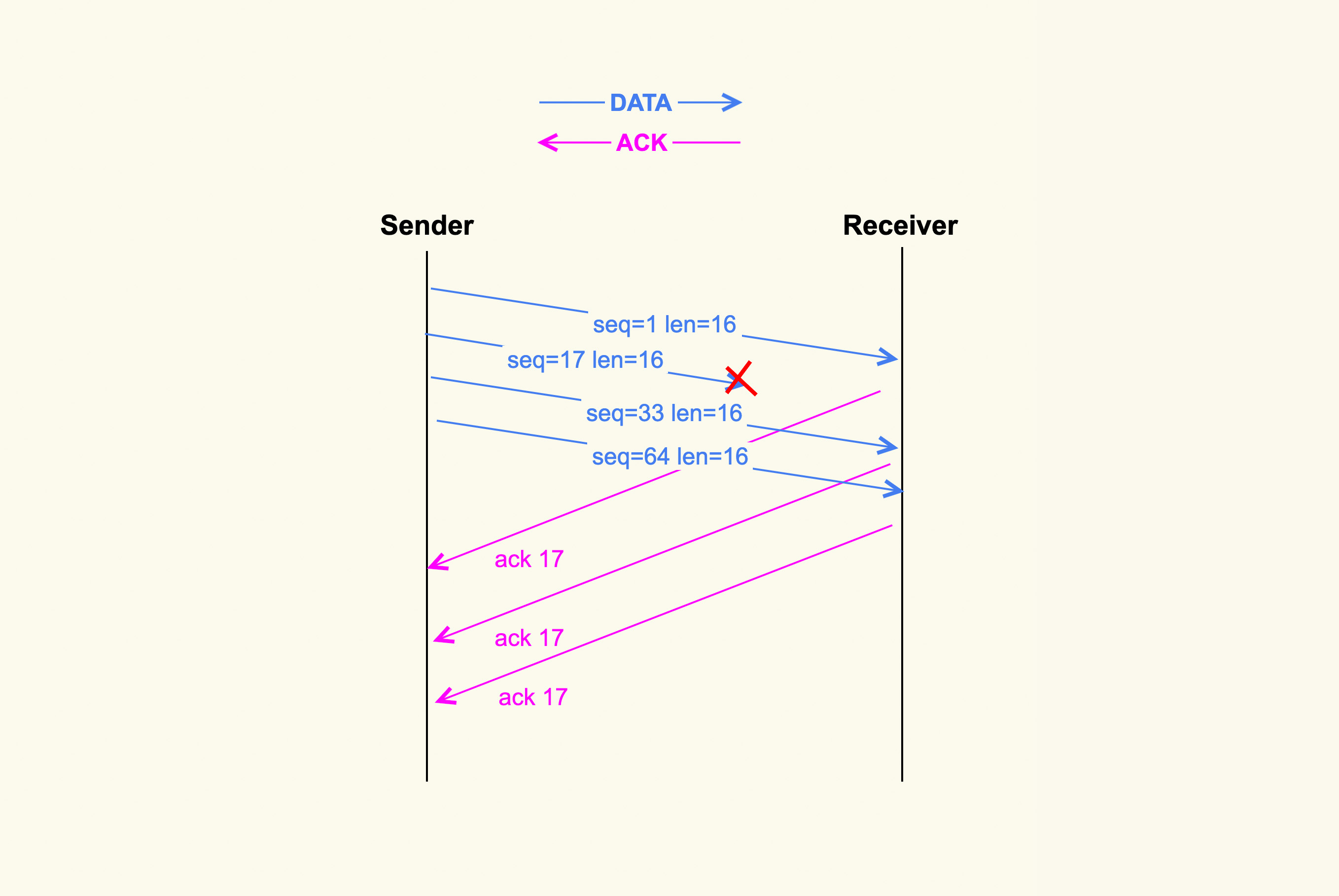 我们再回到上面这张图,因为接收端没有接收到第2个segment,因此接收端每次收到一个新的segment后都会去ack第2个segment,即ack 17。紧接着,发送端就会接收到三个相同的ack(ack 17)。连续出现了3个响应的ack后,发送端会据此判断数据包出现了丢失,于是就进入了下一个阶段:快速重传。