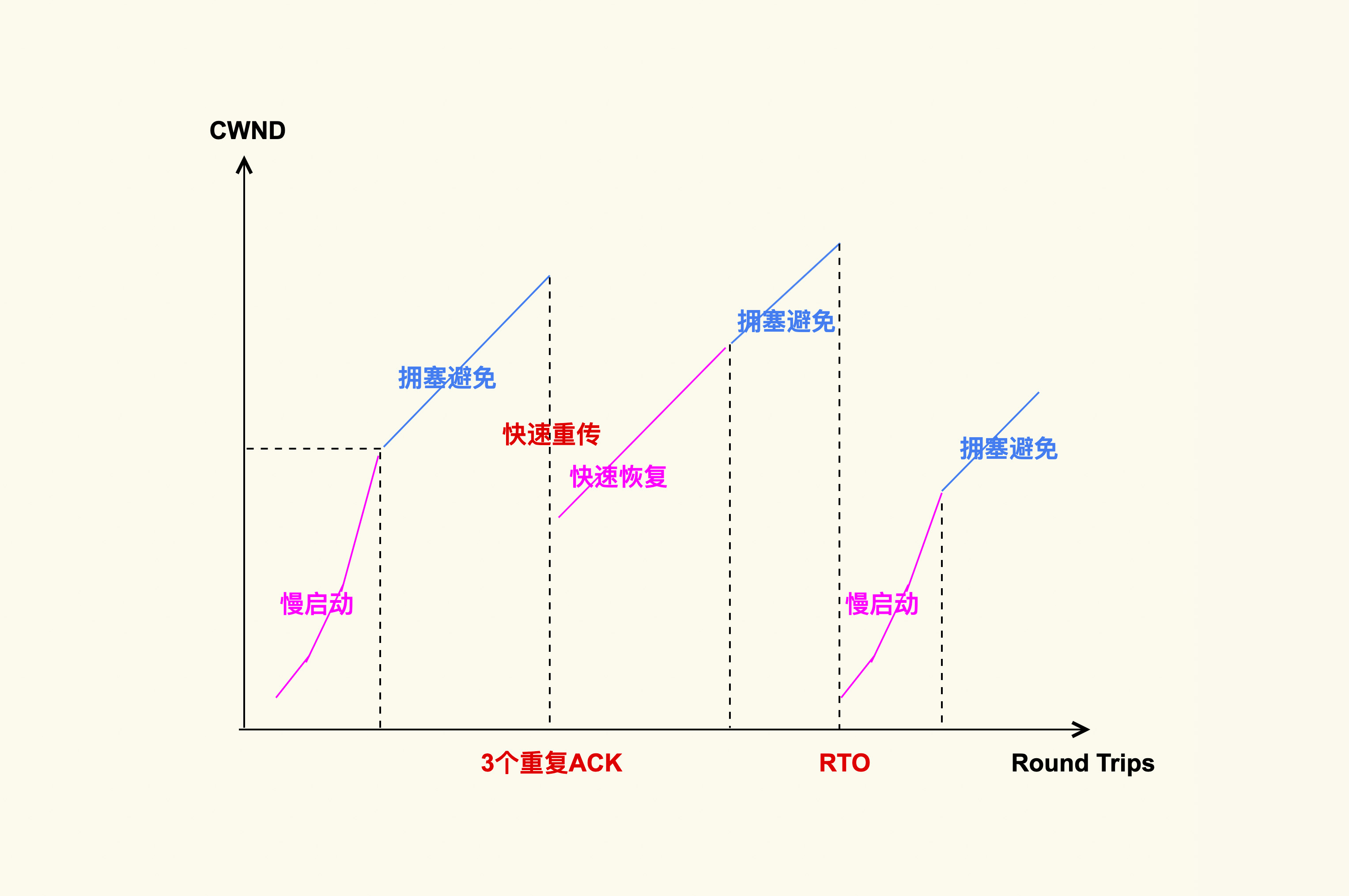 除了快速重传外,还有一种重传机制是超时重传。不过,这是非常糟糕的一种情况。如果发送出去一个数据包,超过一段时间(RTO)都收不到它的ack,那就认为是网络出现了拥塞。这个时候就需要将cwnd恢复为初始值,再次从慢启动开始调整cwnd的大小。