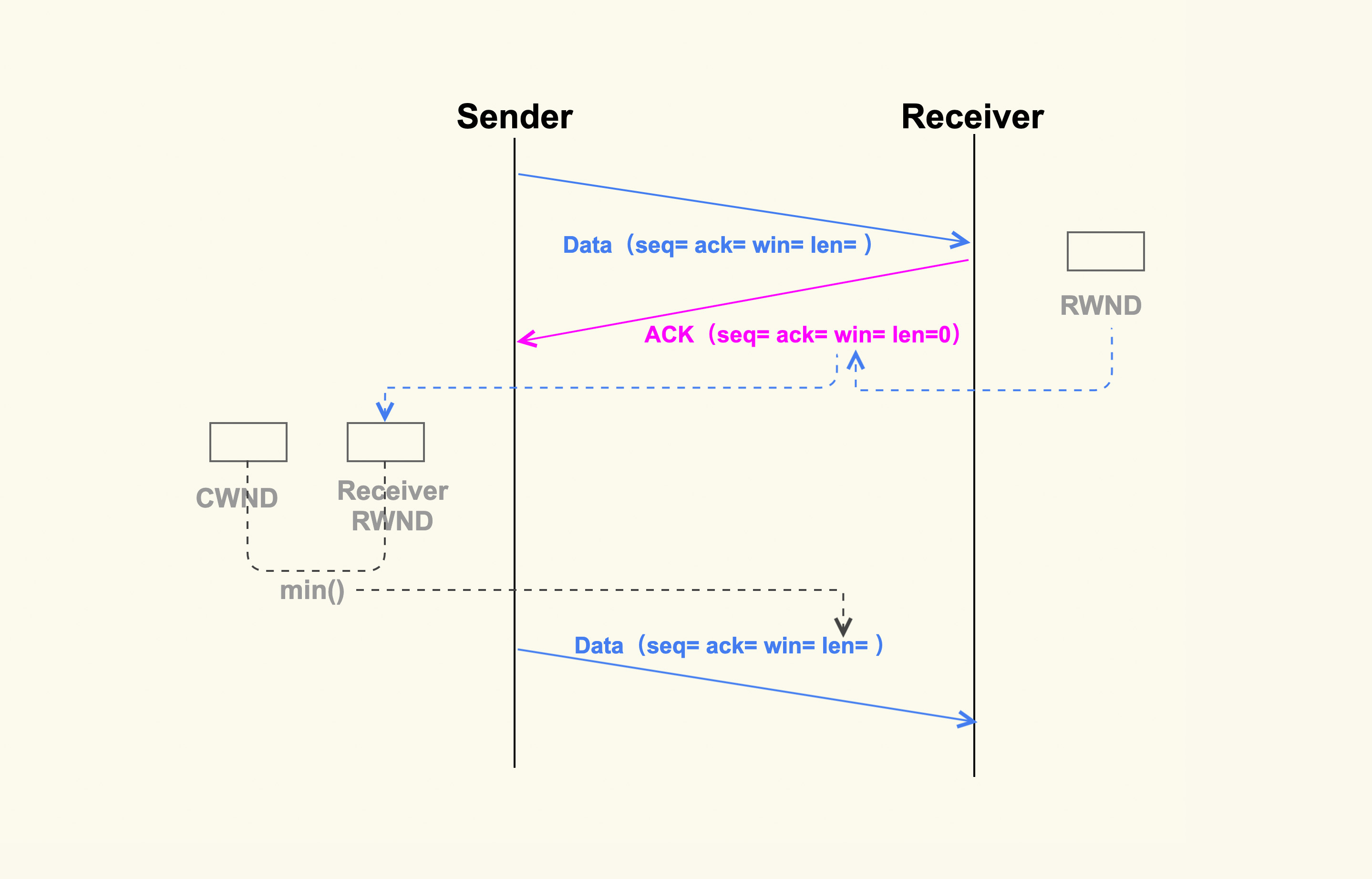 如上图所示,接收方在收到数据包后,会给发送方回一个ack,然后把自己的rwnd大小写入到TCP头部的win这个字段,这样发送方就能根据这个字段来知道接收方的rwnd了。接下来,发送方在发送下一个TCP segment的时候,会先对比发送方的cwnd和接收方的rwnd,得出这二者之间的较小值,然后控制发送的TCP segment个数不能超过这个较小值。