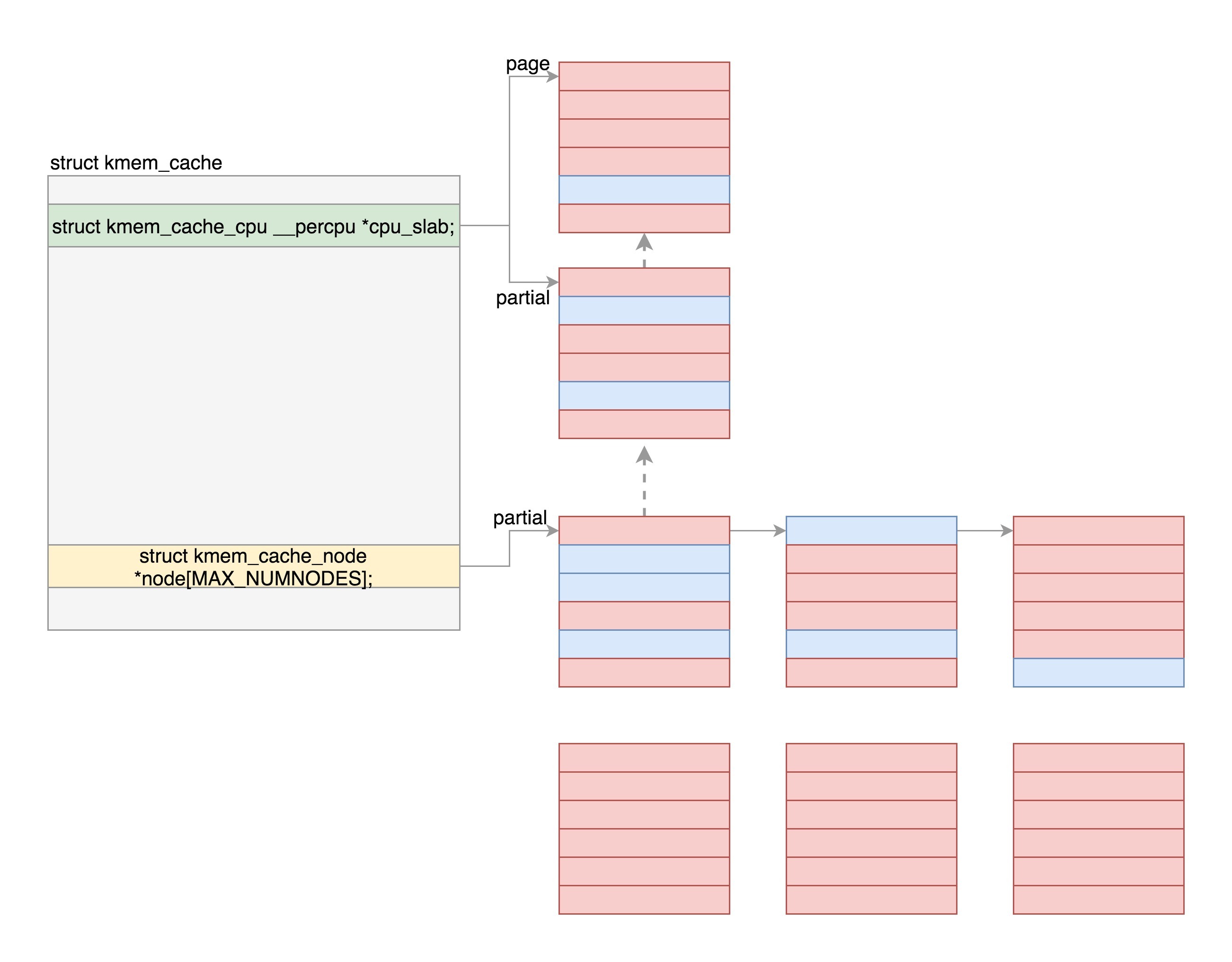 struct kmem_cache_cpu { void **freelist; /* Pointer to next available object */ unsigned long tid; /* Globally unique transaction id */ struct page *page; /* The slab from which we are allocating */ #ifdef CONFIG_SLUB_CPU_PARTIAL struct page *partial; /* Partially allocated frozen slabs */ #endif ...... };