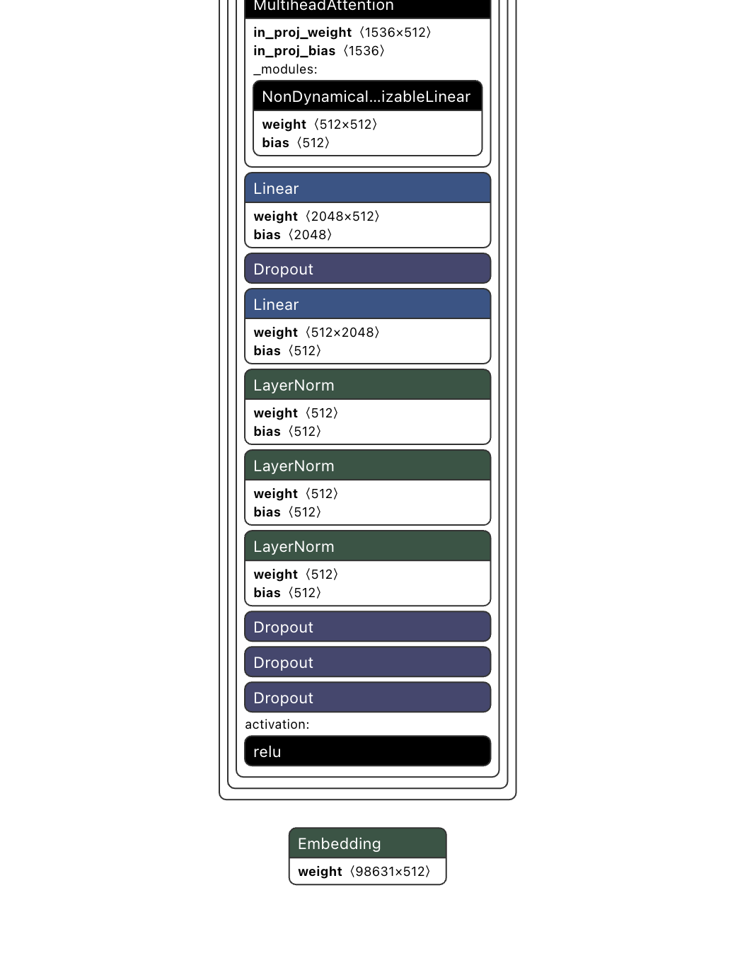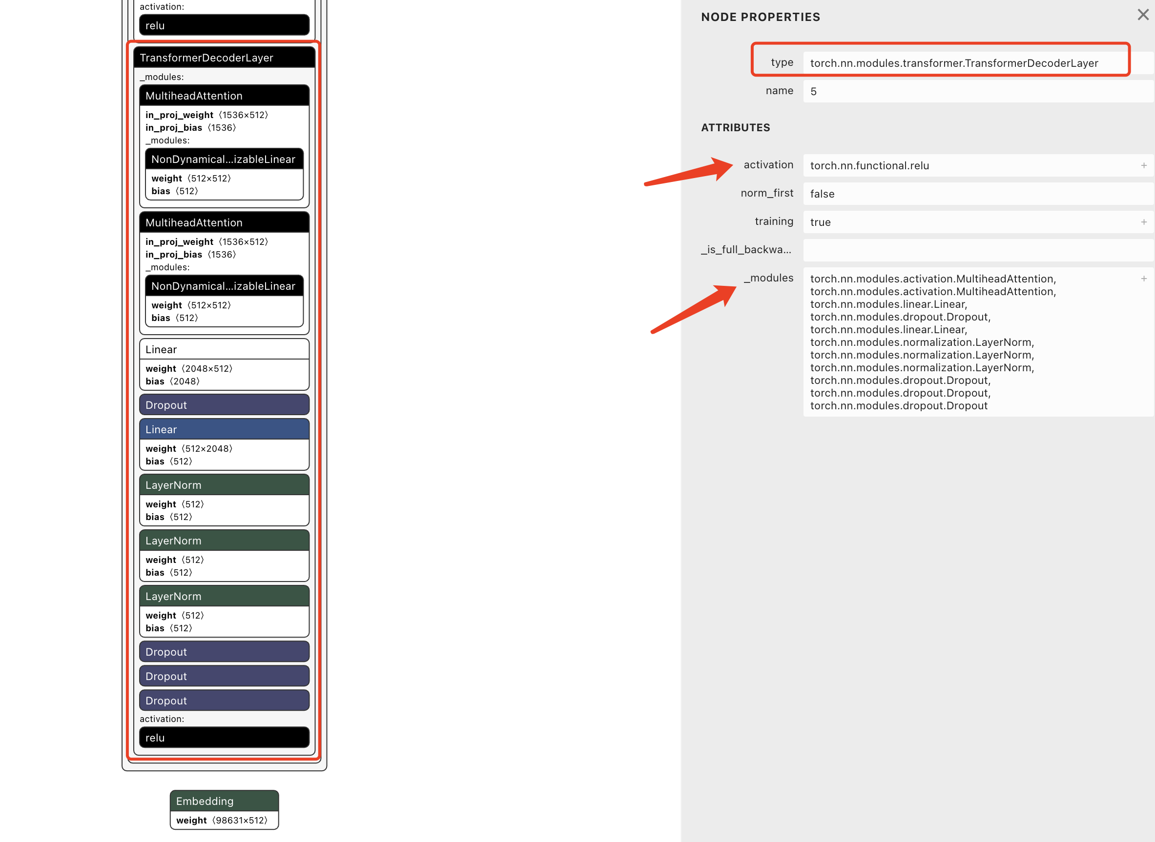 我们选中其中一个TransformerDecoderLayer层,右侧会展示这一层的详细信息,可以看到具体的实现类是torch.nn.modules.transformer.TransformerDecoderLayer,包含下面这些组件:
