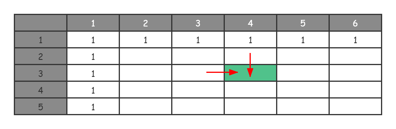 从表格中我们可以看出,第一行和第一列是格子的序号。其中填写了 1 的格子,就是初始状态,深色的格子就是DP[i][j],表示第 i 行、第 j 列的路径数量。我们可以计算一下,这个格子的路径数量是 DP[i-1][j] + DP[i][j-1]。