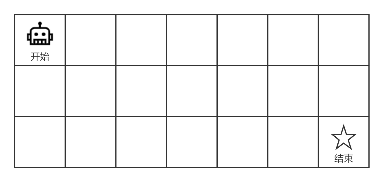 问题:一个机器人位于一个 m * n 网格的左上角 (起始点在下图中标记为“开始” ),机器人每次只能向下或者向右移动一步,现在机器人试图达到网格的右下角(在下图中标记为“结束”)。问总共有多少条不同的路径?