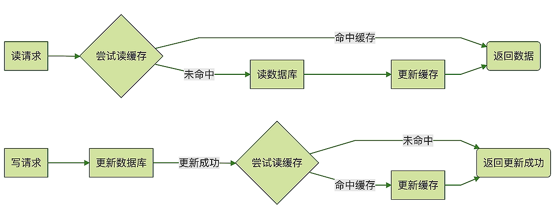 Cache Aside模式和上面的Read/Write Through模式非常像,它们处理读请求的逻辑是完全一样的,唯一的一个小差别就是,Cache Aside模式在更新数据的时候,并不去尝试更新缓存,而是去删除缓存。