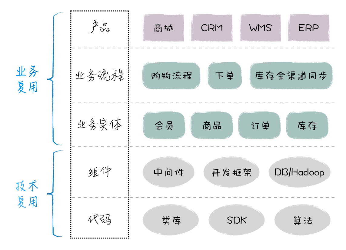 从复用的程度来看,从高到低,我们可以依次划分为产品复用>业务流程复用>业务实体复用>组件复用>代码复用。