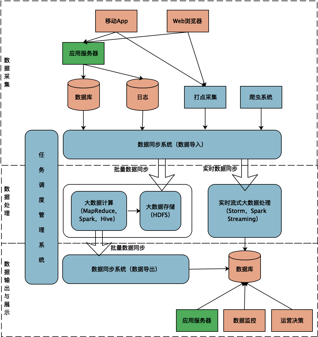 我们先看下大数据平台架构。上面说过,大数据平台主要就是跨越需要长时间处理的大数据计算和需要实时响应的互联网应用之间的鸿沟,使系统成为一个完整的整体。