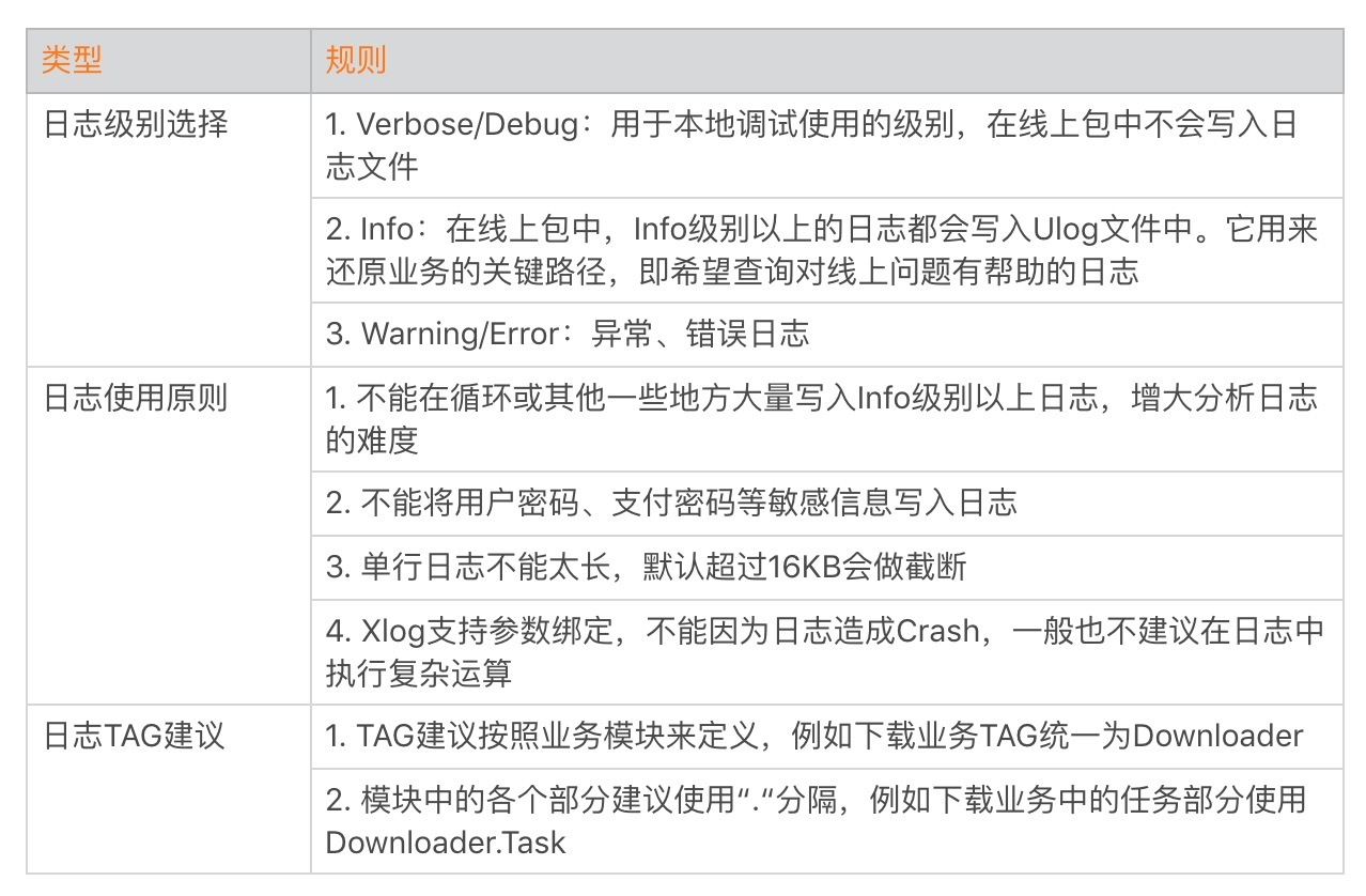 所以微信制定了严格的日志规范,定期对拉取的日志作规则检查,一旦发现有违反规则的情况,会作出一定的处罚。下面是其中的一些日志规范,我选取一些分享给你。
