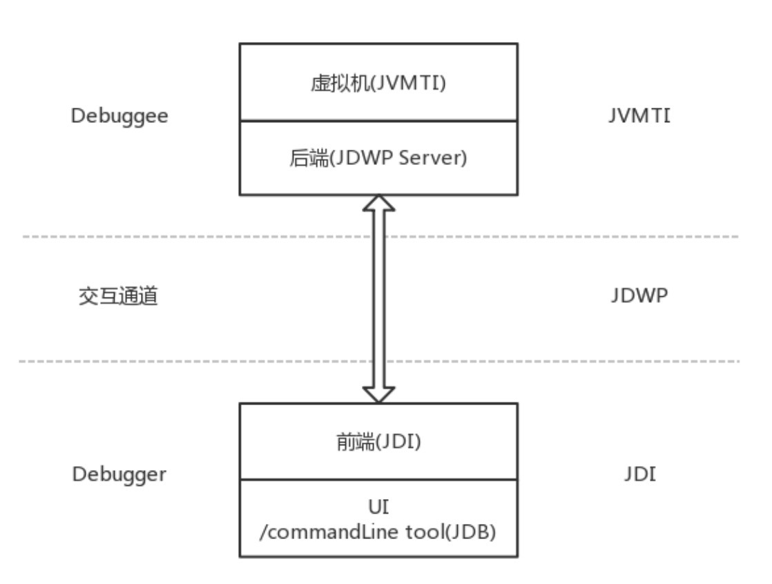 其实我们的学习委员鹏飞之前已经讲过这块内容了,回到“[Android JVM TI机制详解]”中说到的Debugger Architecture。Java的调试框架是通过JPDA(Java Platform Debugger Architecture,Java平台调试体系结构),它定义了一套独立且完整的调试体系,主要由以下三部分组成: