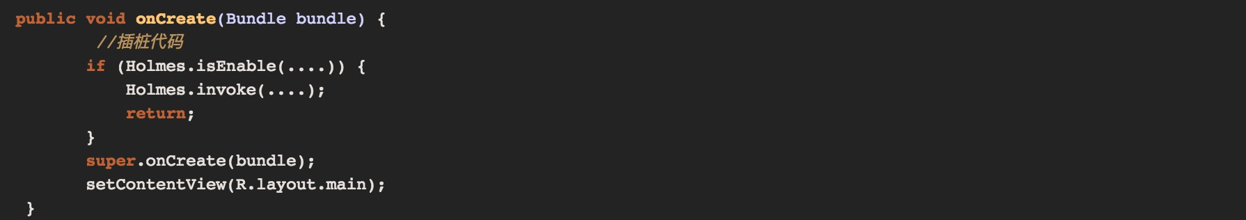 Holmes的实现跟美团的Robust热修复思路差不多,需要对每个方法进行了插桩来记录方法执行路径,也就是在方法的开头插入一段桩代码,当方法运行的时候就会记录方法签名、进程、线程、时间等形成一条完整的执行信息。但是这套方案性能的技术难点比较多,一般只会动态针对出现问题的用户开启。