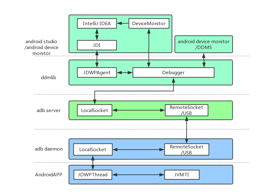 对于Android来说,它的调试框架也是在Java调试框架基础上进行的扩展,主要包括Android Studio(JDI)、ddmlib、adb server、adb daemon、Android应用这五个组成部分。