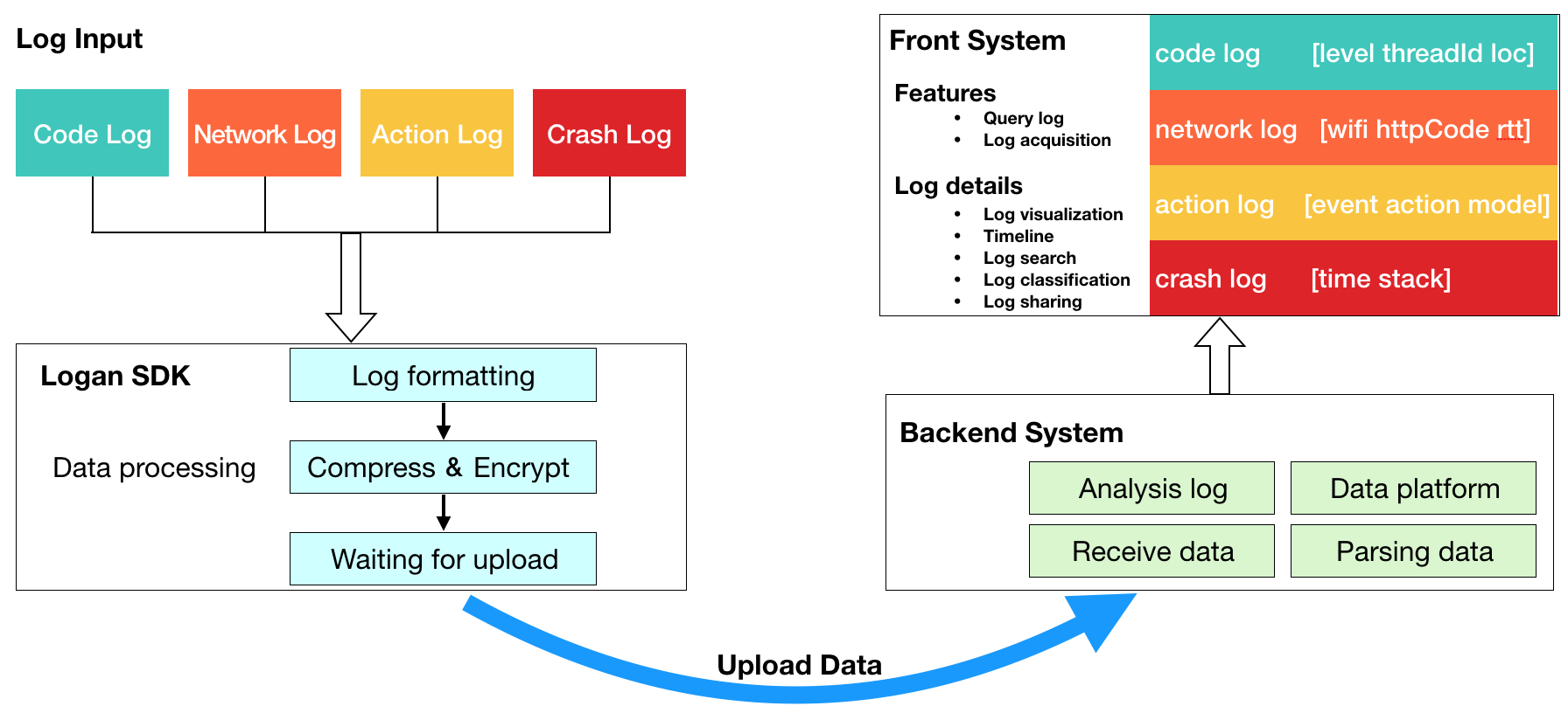 对于移动应用来说,我们可能会有各种各样的日志类型,例如代码日志、崩溃日志、埋点日志、用户行为日志等。由于不同类型的日志都有自己的特点,这样会导致日志比较分散,比如我们要查一个问题,需要在各个不同的日志平台查不同的日志。美团为了解决这个问题,提出了统一日志平台的思路,也在Github开源了自己的移动端基础日志库Logan。