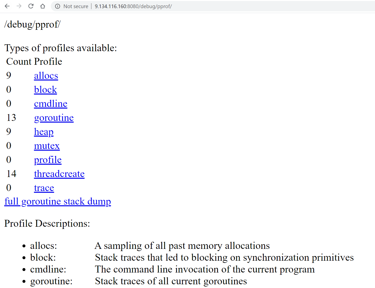 上面的代码根据配置--feature.profiling来判断是否开启HTTP性能分析功能。我们开启完HTTP性能分析,启动HTTP服务iam-apiserver后,即可访问http:// x.x.x.x:8080/debug/pprof(x.x.x.x是Linux服务器的地址)来查看profiles信息。profiles信息如下图所示: