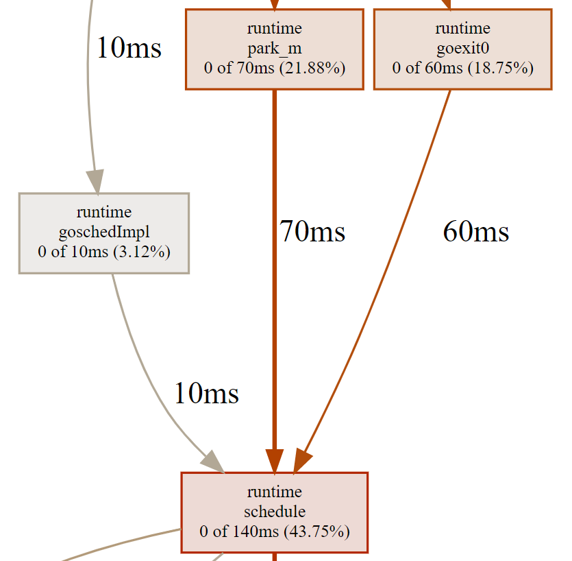 runtime.schedule的累积采样时间(140ms)中,有10ms来自于runtime.goschedImpl函数的直接调用,有70ms来自于runtime.park_m函数的直接调用。这些数据可以说明runtime.schedule函数分别被哪些函数调用,并且调用频率有多大。也因为这个原因,函数runtime.goschedImpl对函数runtime.schedule的调用时间必定小于等于函数runtime.schedule的累积采样时间。