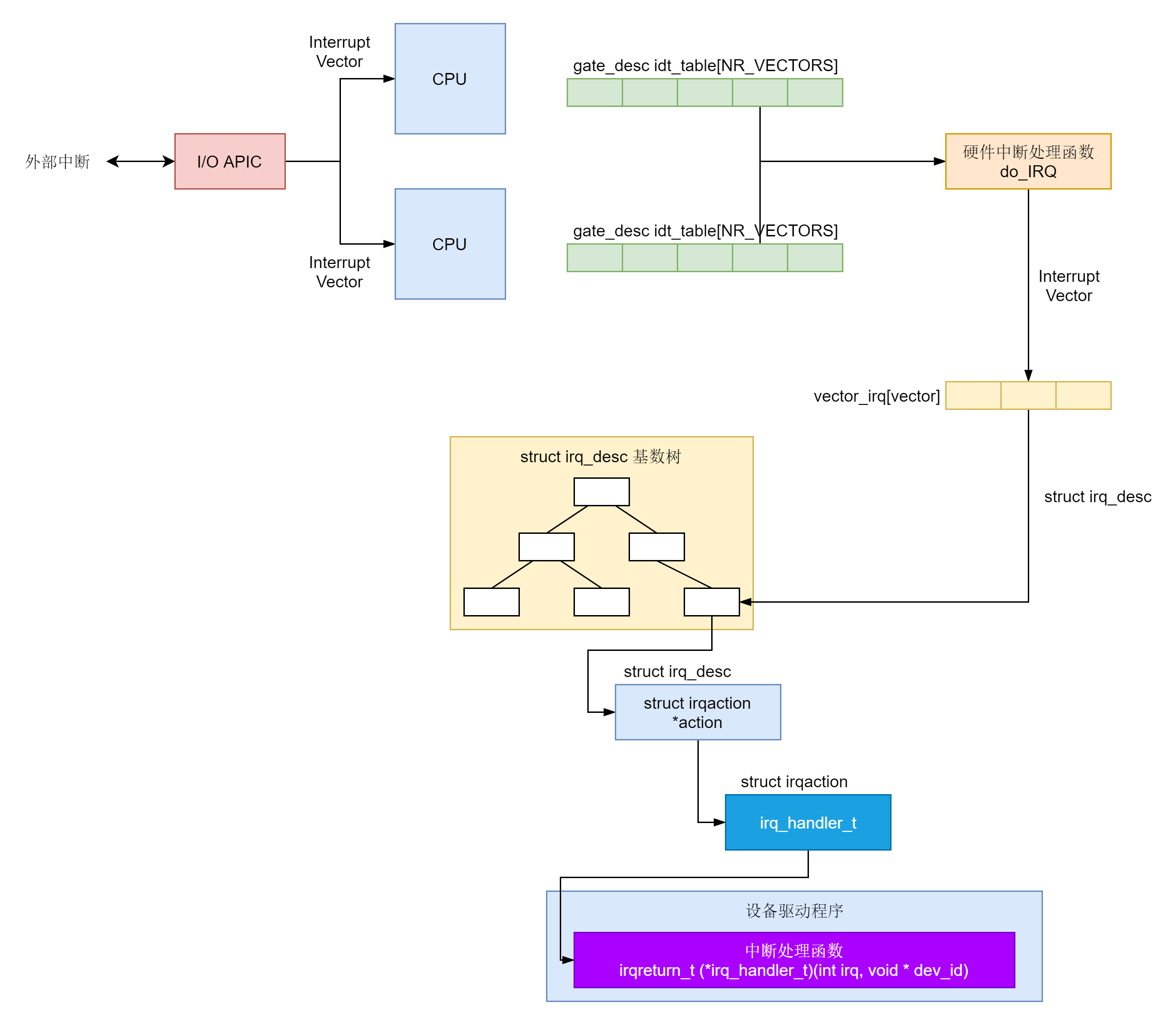 /* * do_IRQ handles all normal device IRQ's (the special * SMP cross-CPU interrupts have their own specific * handlers). */ __visible unsigned int __irq_entry do_IRQ(struct pt_regs *regs) { struct pt_regs *old_regs = set_irq_regs(regs); struct irq_desc * desc; /* high bit used in ret_from_ code */ unsigned vector = ~regs->orig_ax; ...... desc = __this_cpu_read(vector_irq[vector]); if (!handle_irq(desc, regs)) { ...... } ...... set_irq_regs(old_regs); return 1; }