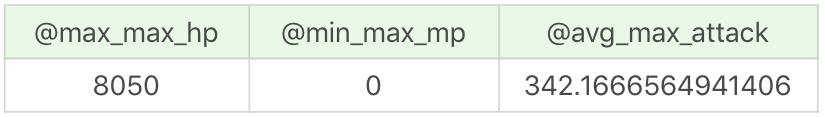 1 | CALL get_hero_scores(@max_max_hp, @min_max_mp, @avg_max_attack, '战士'); |