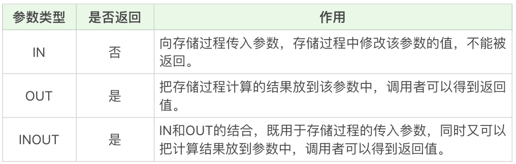 我们再来看下存储过程的3种参数类型。在刚才的存储过程中,我们使用了IN类型的参数,另外还有OUT类型和INOUT类型,作用如下: