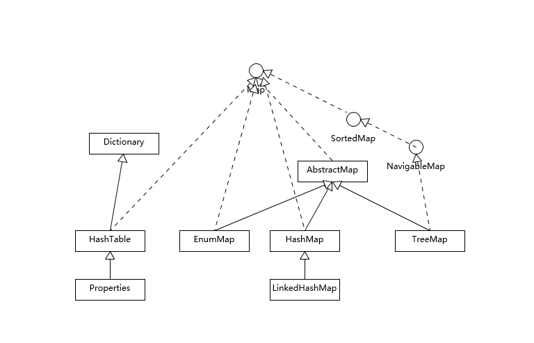 HashMap等其他Map实现则是都扩展了AbstractMap,里面包含了通用方法抽象。不同Map的用途,从类图结构就能体现出来,设计目的已经体现在不同接口上。