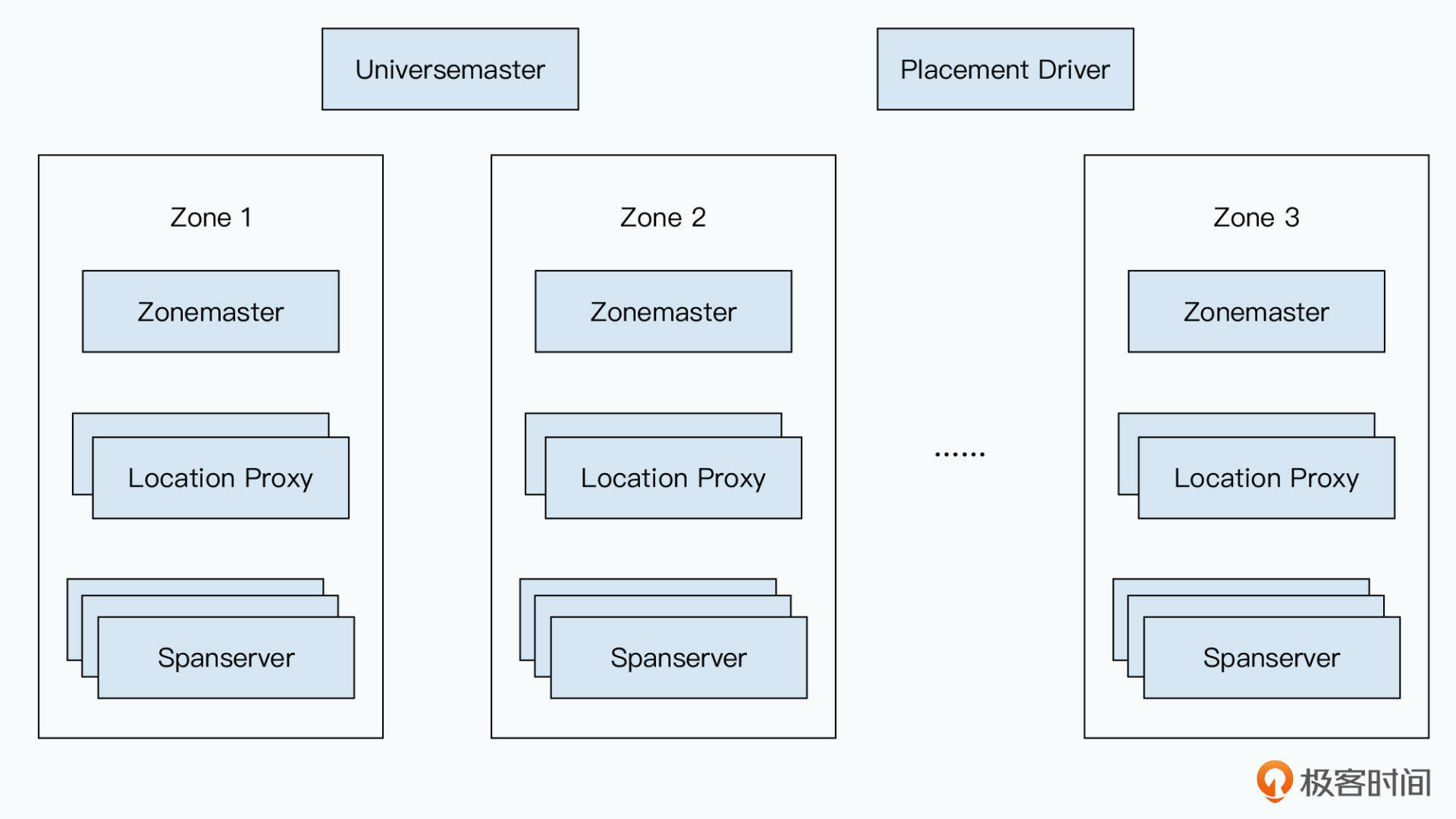在单个Zone内,Spanner拥有Zonemaster、Spanserver和Location Proxy三种不同类型的服务器,它们可以对应到Bigtable里的Master、Tablet Server以及METADATA数据表。而多个Zone之上,Spanner会通过Universemaster来作为控制台,并且提供Zone的各种信息方便debug,以及通过Placement Driver,进行实际的数据分布和调度。