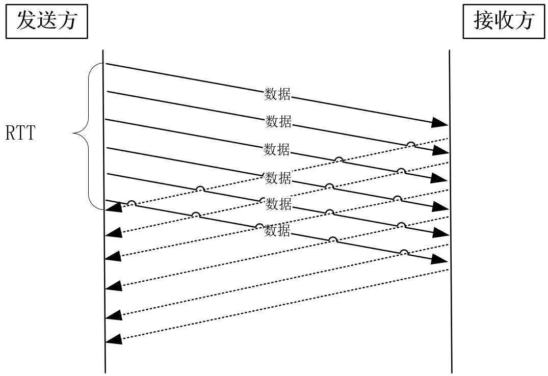 如果我们发送一个报文,收到ACK确认后,再发送下一个报文,会有什么问题?显然,发送每个报文都需要经历一个RTT时延(RTT的值可以用ping命令得到)。要知道,因为网络设备限制了报文的字节数,所以每个报文的体积有限。