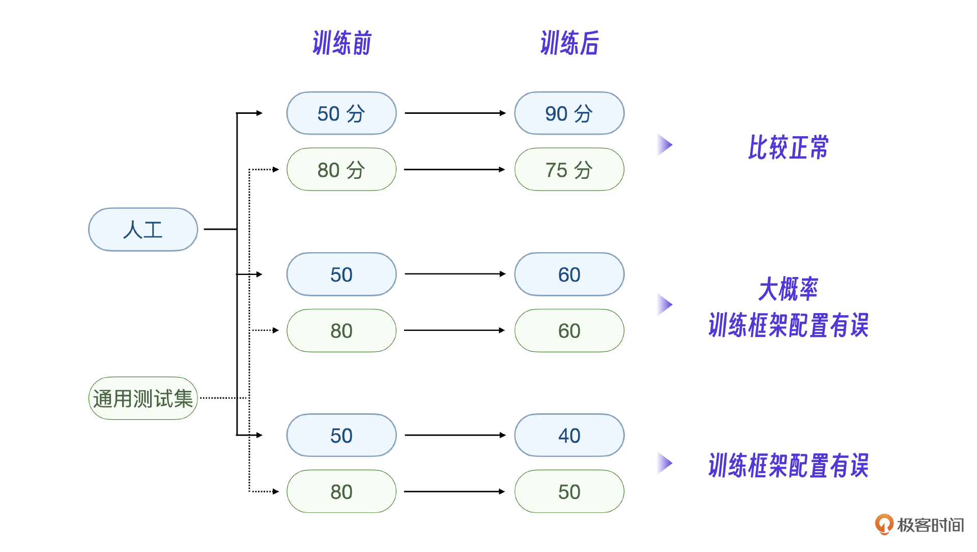 比如,在模型训练中,模型训练跑了1万步左右,做一次人类评分,同时做私有task评分,此时人类评分7,私有task评分5分,继续跑到2万步在做一次测评。如果私有task下降到2分,大概率出问题了。如果跑到2万步,私有task增加到6分,则训练正常。