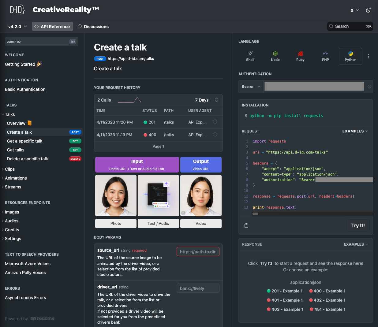 之后,你可以查看一下D-ID的文档,里面不仅有API的使用说明,还有一个类似Playground的界面,你可以设置参数,并且可以测试调用API。