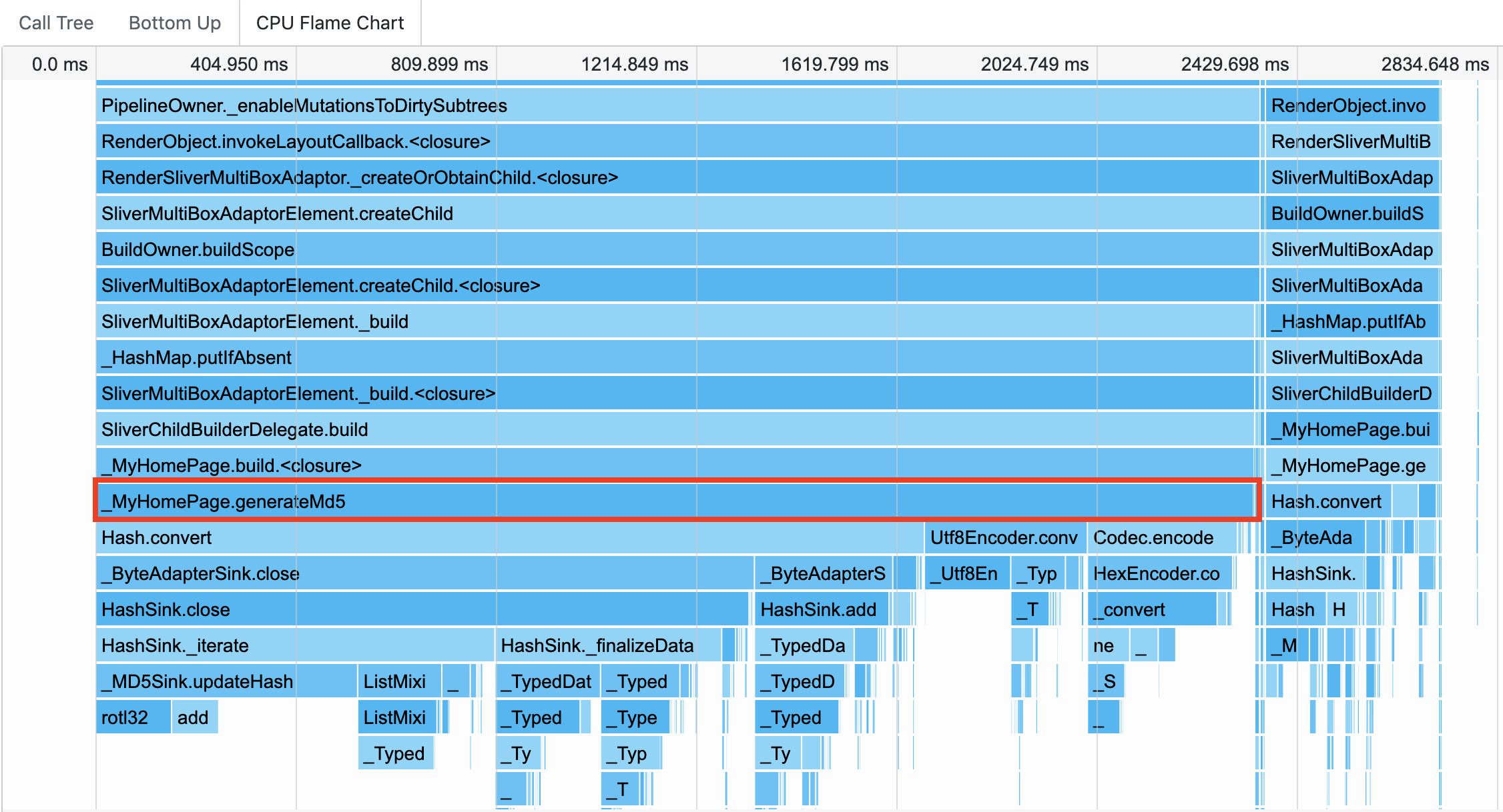 可以看到,_MyHomePage.generateMd5函数的执行时间最长,几乎占满了整个火焰图的宽,而这也与代码中存在的问题是一致的。