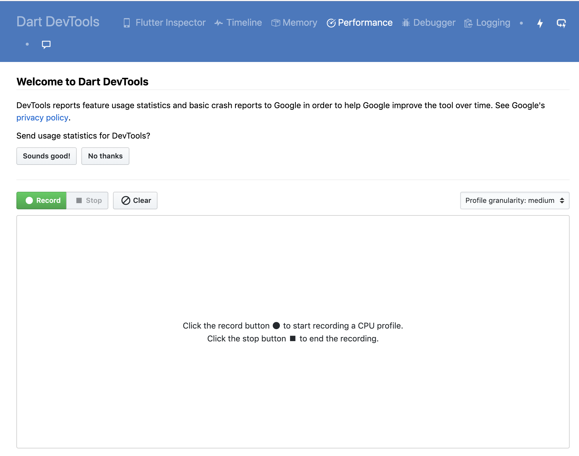 在点击了Android Studio底部工具栏中的“Open DevTools”按钮之后,系统会自动打开Dart DevTools的网页,将顶部的tab切换到Performance后,我们就可以开始分析代码中的性能问题了。