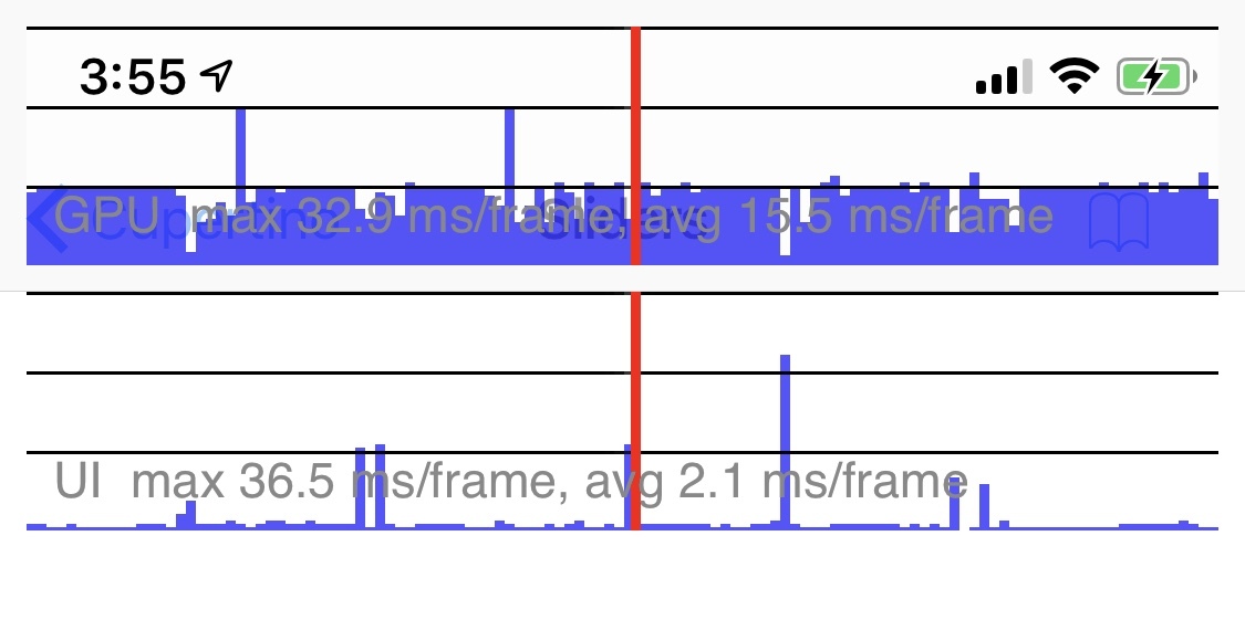 下图演示了性能图层的展现样式。其中,GPU线程的性能情况在上面,UI线程的情况显示在下面,蓝色垂直的线条表示已执行的正常帧,绿色的线条代表的是当前帧: