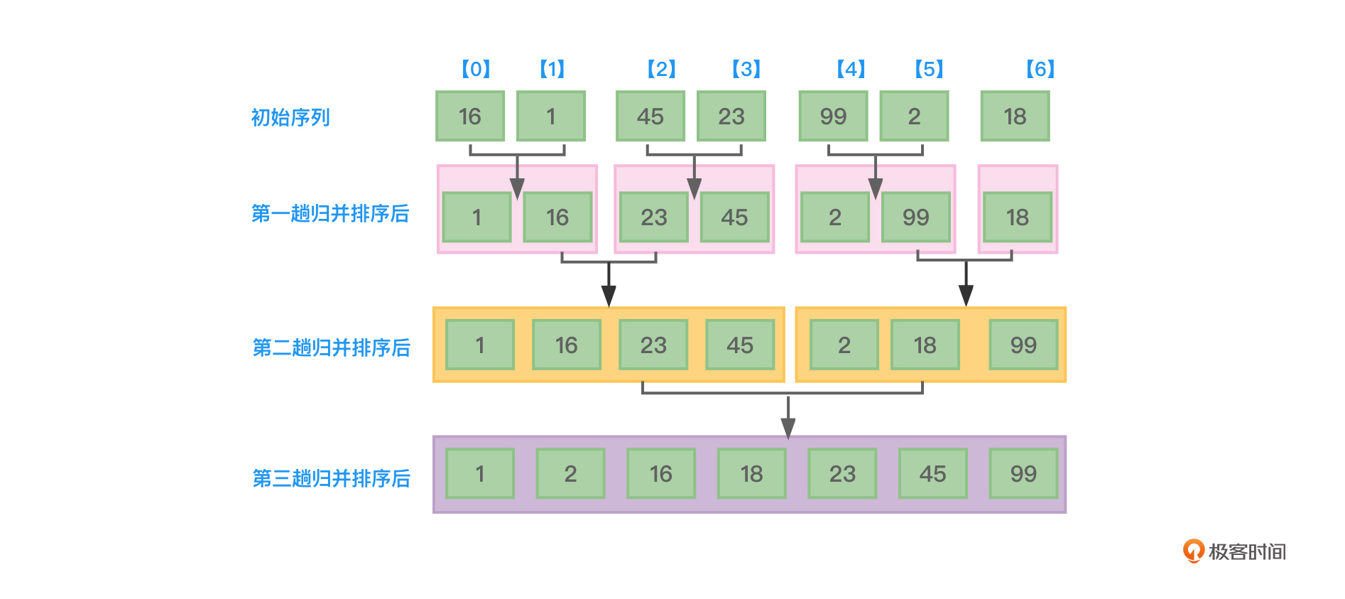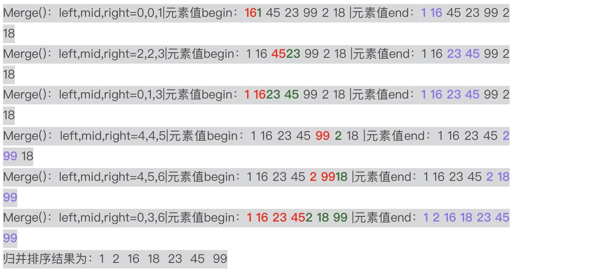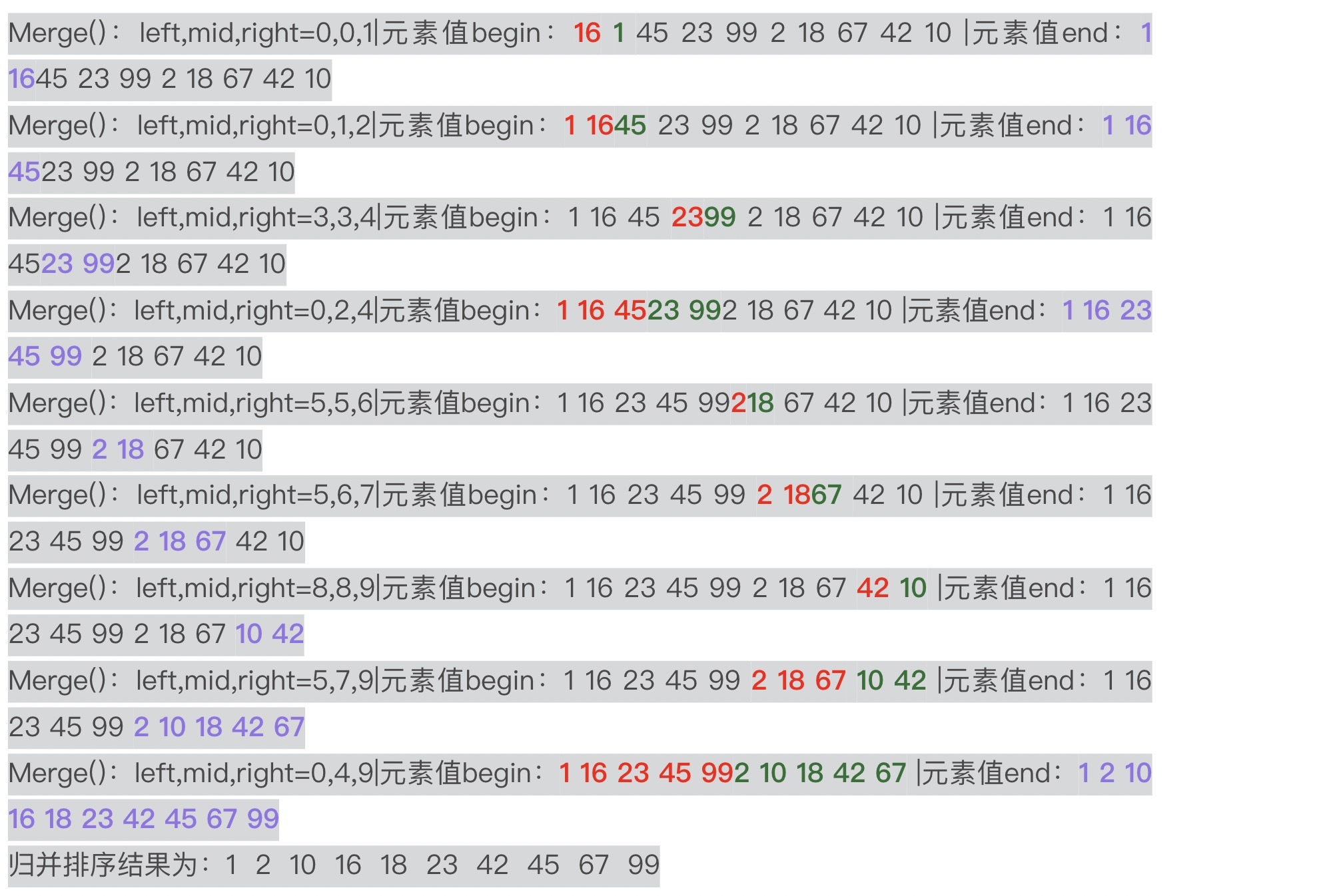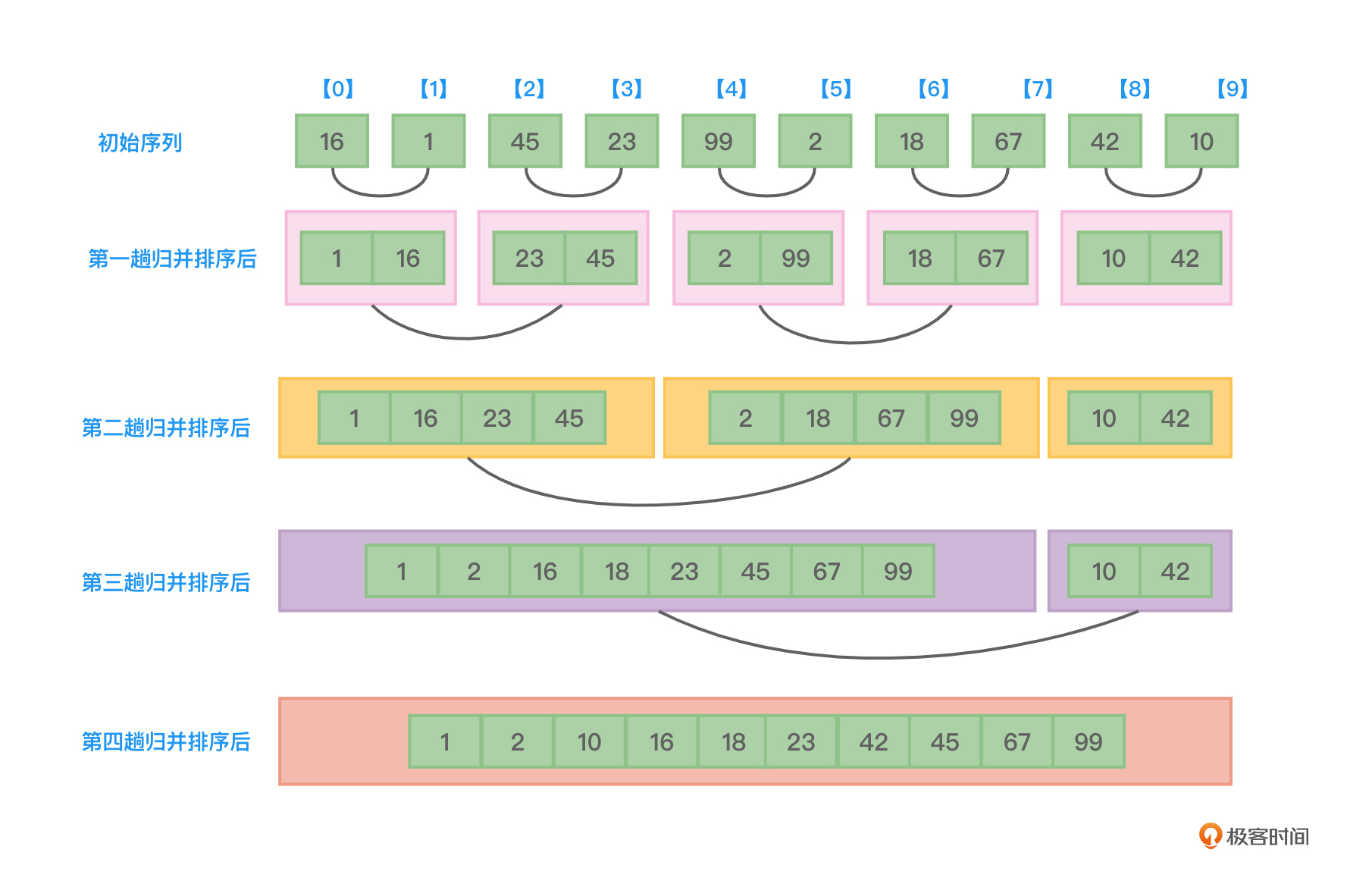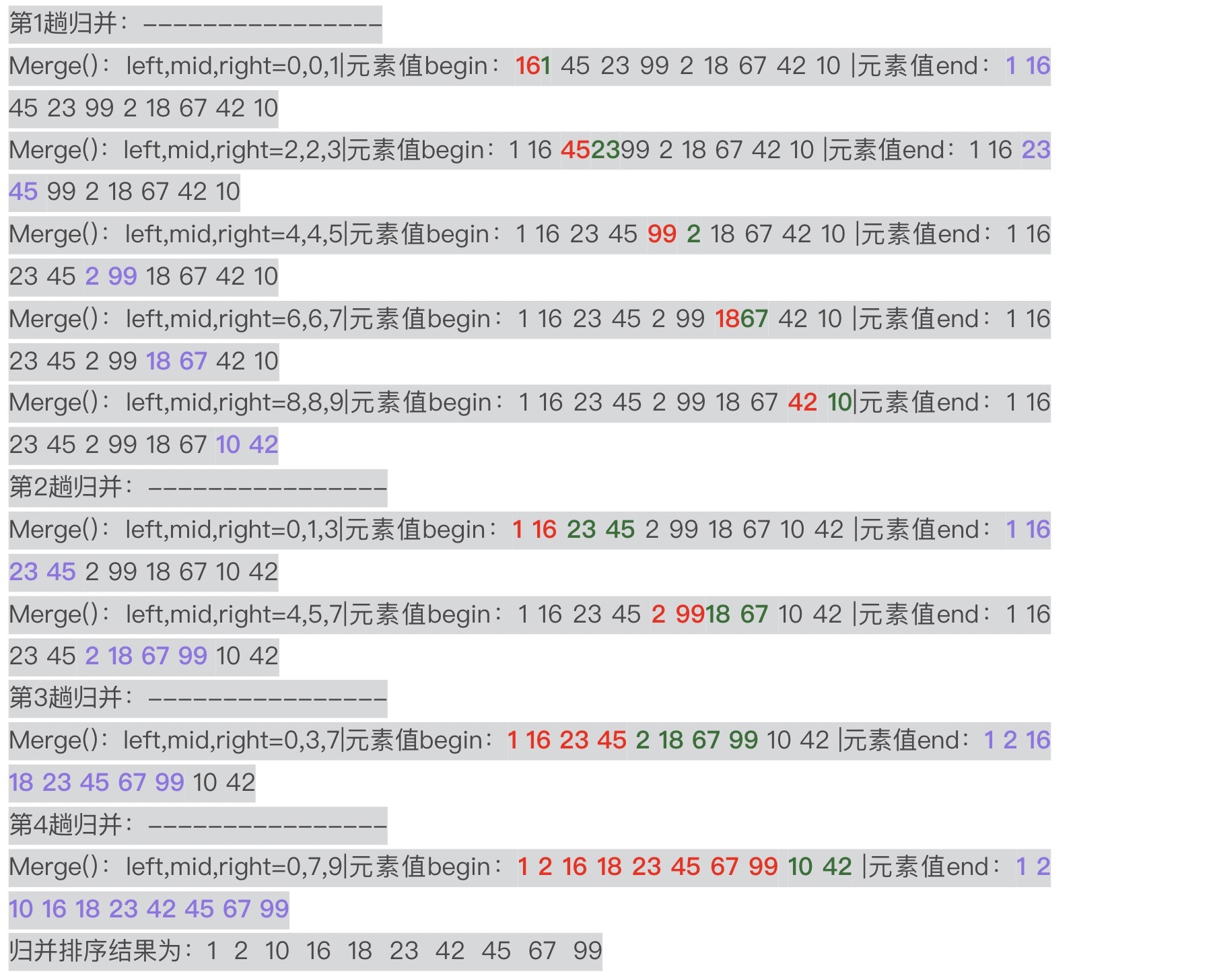 上述结果正是图4展示的结果。我在结果中用了不同的颜色和字体加粗来标注每趟2路归并排序比较与合并的是哪两个子序列,你可以重点关注一下。