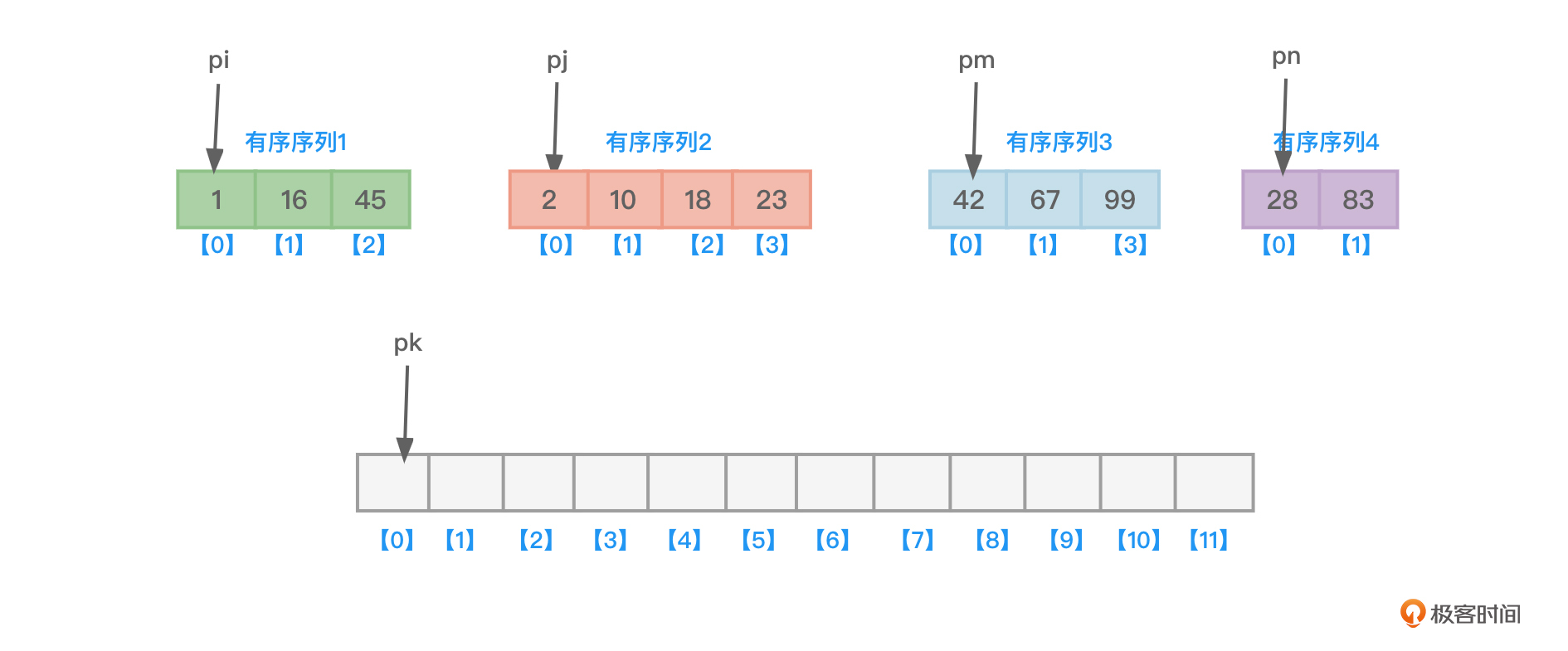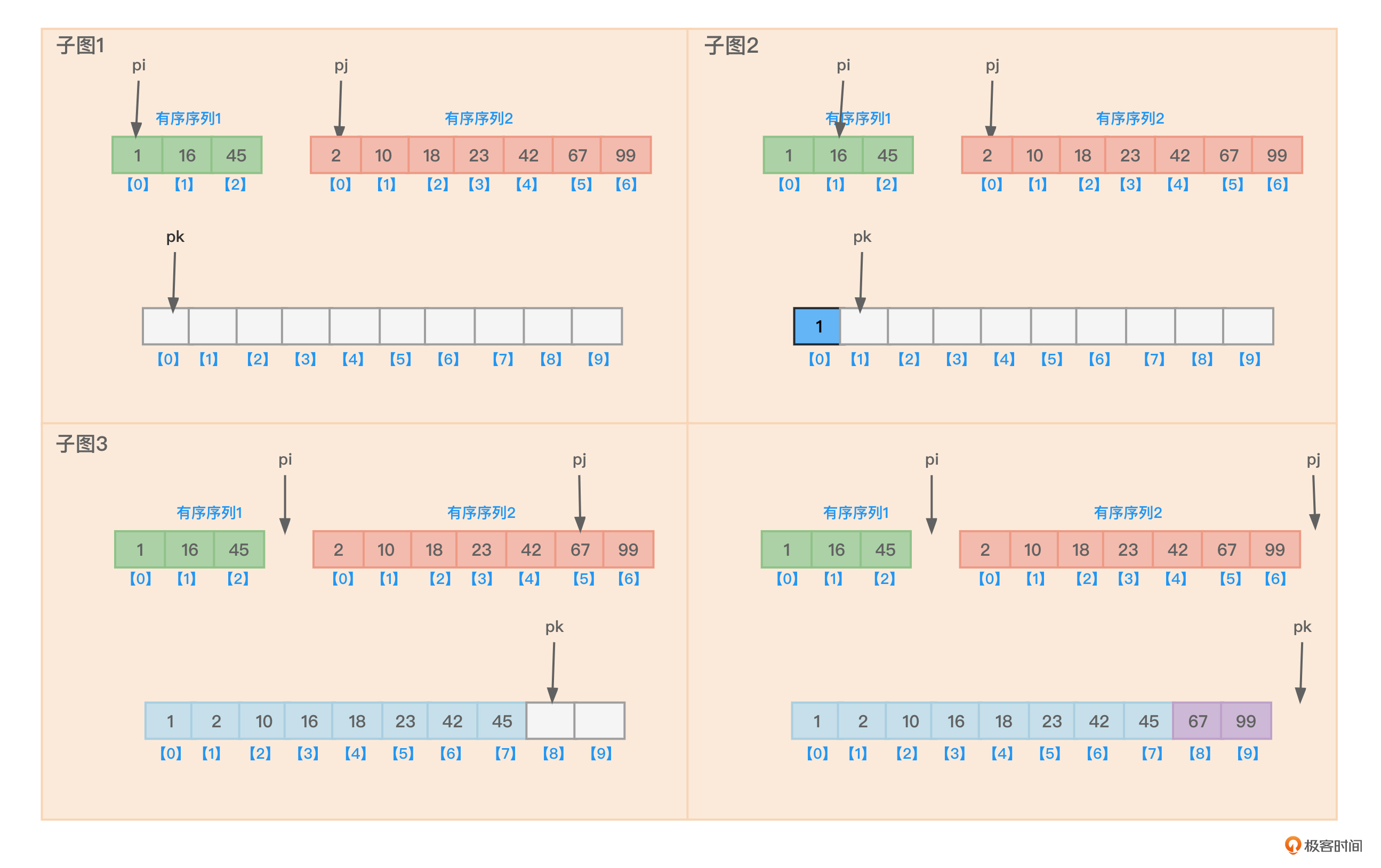 - 针对每个数组都设置一个指向当前位置的指针(pi、pj、pk),初始状态时,这三根指针都指向数组的起始位置,如图2中的子图1。