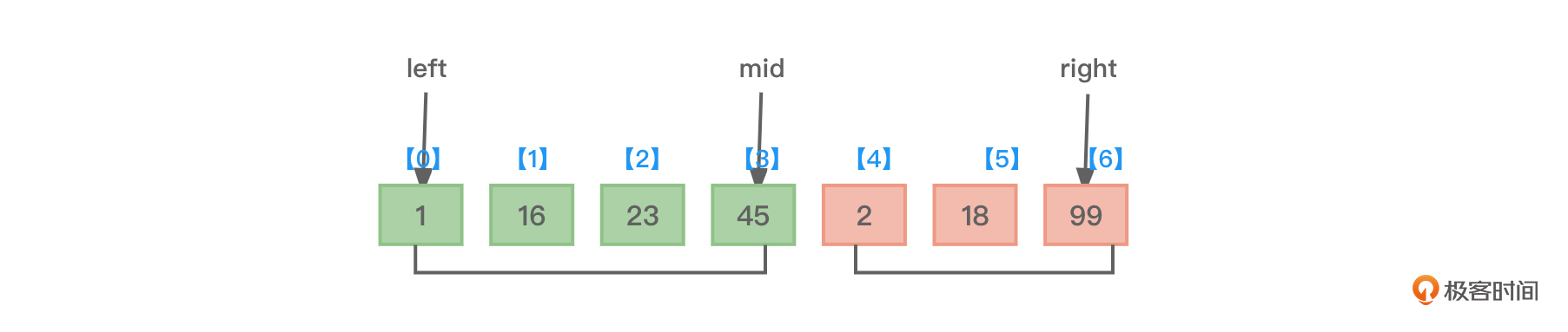 代码中的核心2路归并函数Merge中用到了3个主要的形参,分别是left、mid、right。因为这些参数是用于进行两个子序列的2路归并,所以left用于指向第一个子序列的开头,mid用于指向第一个子序列的末尾,right用于指向第二个子序列的末尾,这两个子序列当然是紧紧相邻的,如此,通过left、mid、right这三个变量就可以把两个子序列的头尾范围准确地标注出来了,可以参考下图5: