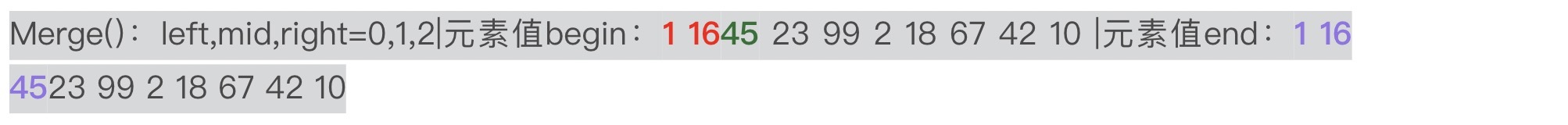 上述这行结果表明代码实现中进行的是 [1,16]和[45]做归并,不是人们以为的[1,16]和[45,23]做归并。