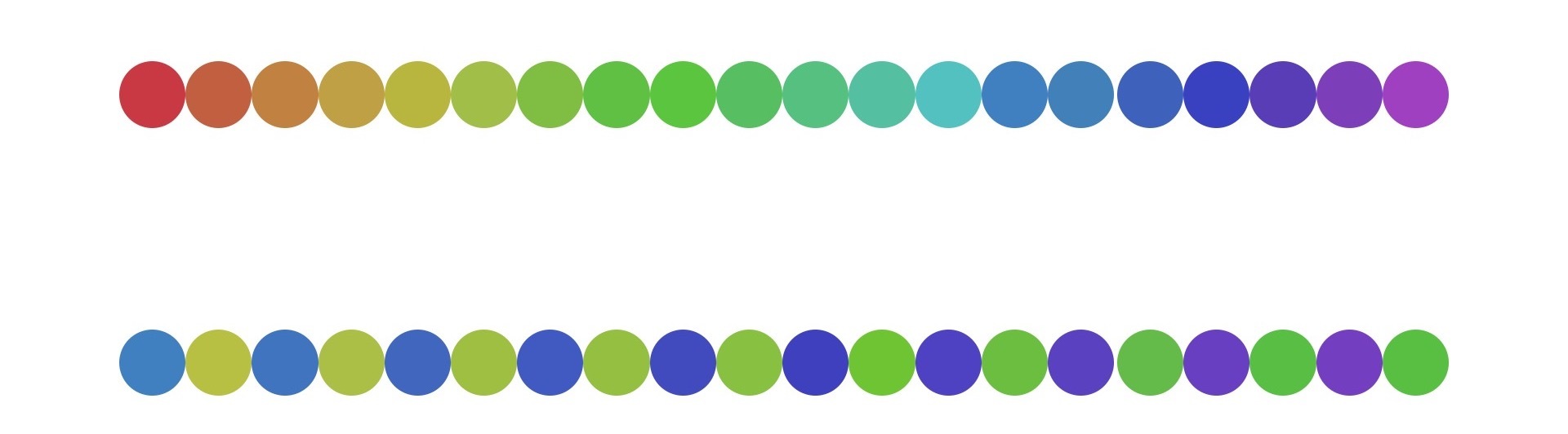 如上面代码所示,我们绘制两排不同的圆,让第一排每个圆的色相间隔都是15,再让第二排圆的颜色在色相60和210附近两两交错。然后,我们让这两排圆的饱和度和亮度都是50%,最终生成的效果如下:
