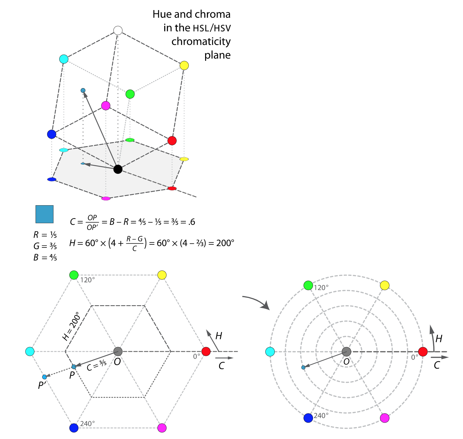 HSL和HSV是怎么表示颜色的呢?实际上,我们可以把HSL和HSV颜色理解为,是将RGB颜色的立方体从直角坐标系投影到极坐标的圆柱上,所以它的色值和RGB色值是一一对应的。