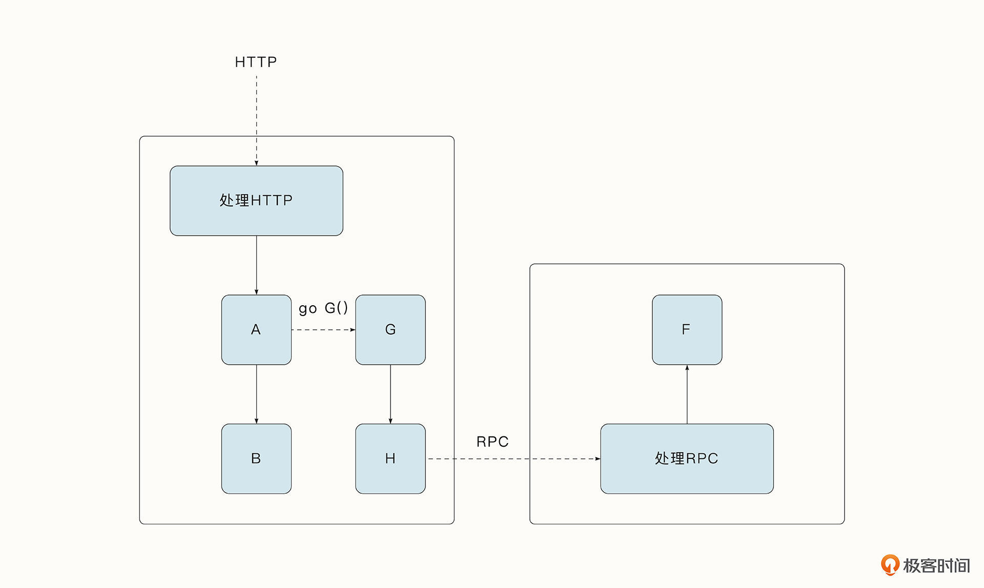 如下图所示,服务器处理 HTTP 请求一般会单独开辟一个协程,假设该处理协程调用了函数A,函数A中也可能创建一个新的协程。假设新的协程调用了函数G,函数G中又有可能通过RPC远程调用了其他服务的API,并最终调用了函数F。