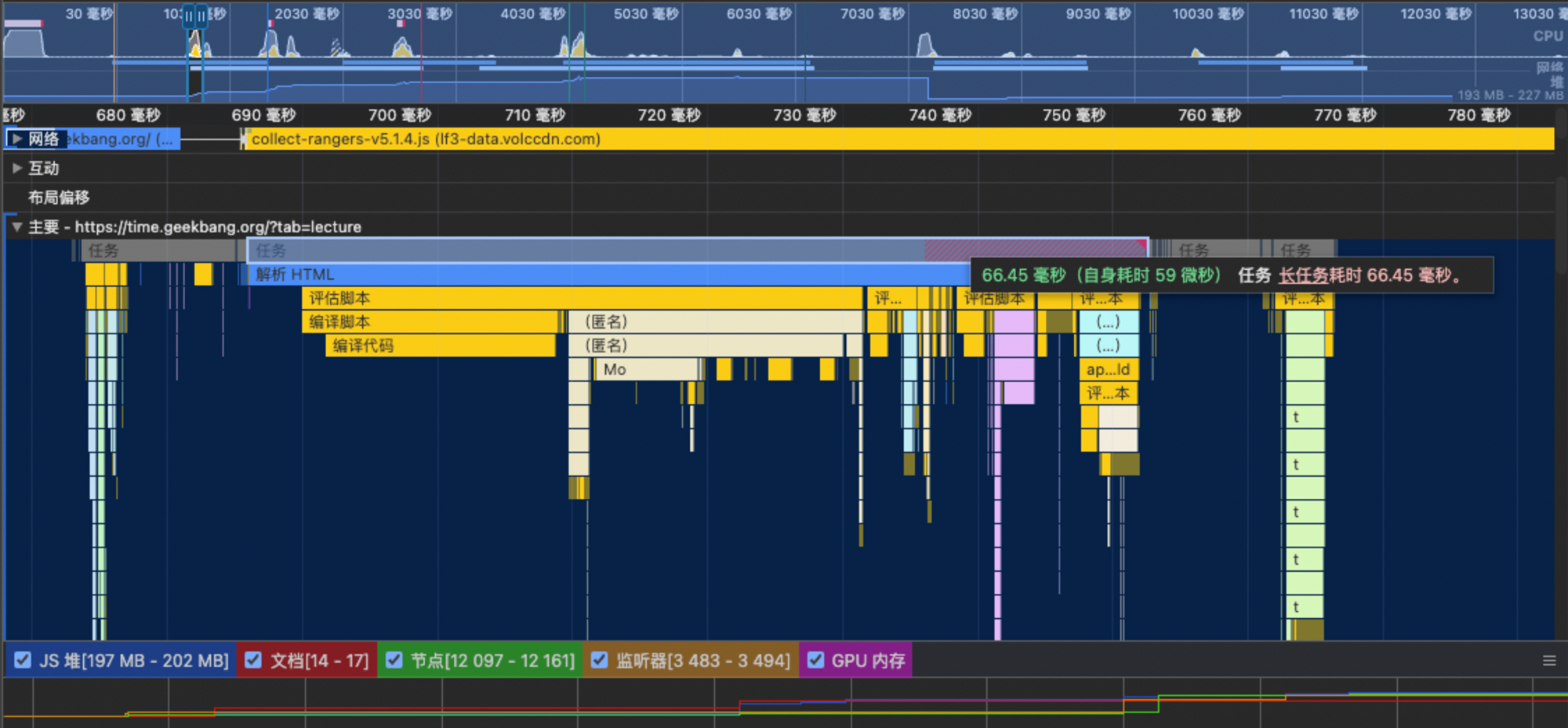 下图是以极客时间官网为例,通过手机访问首页,借用Chrome开发者工具的性能面板看到的一次任务执行情况。