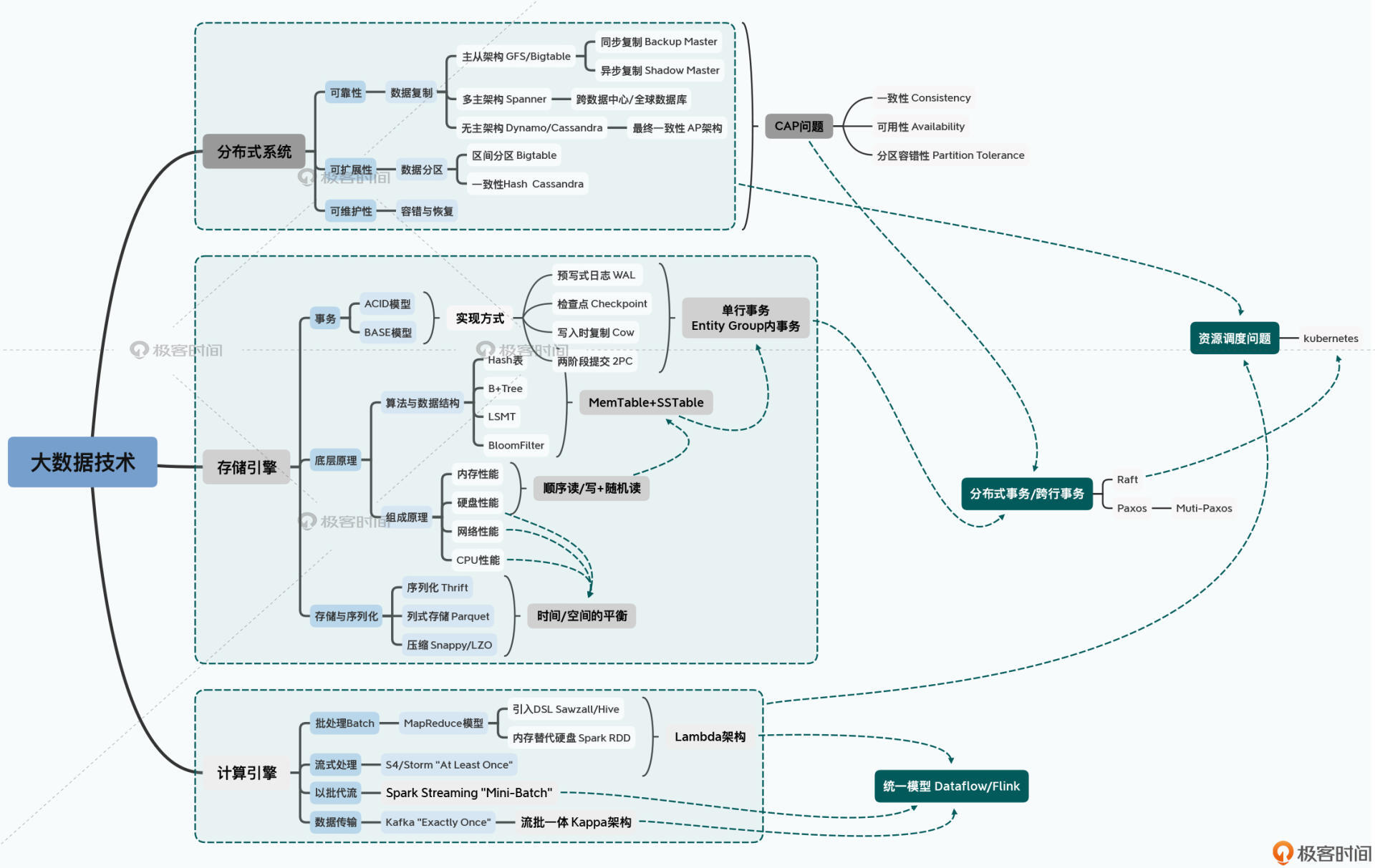 那么,今天这一讲就到这里了。在这一讲的知识地图里,你觉得还可以补上一些什么知识点?在你了解的大数据系统和知识点中,你还能找到什么联系?