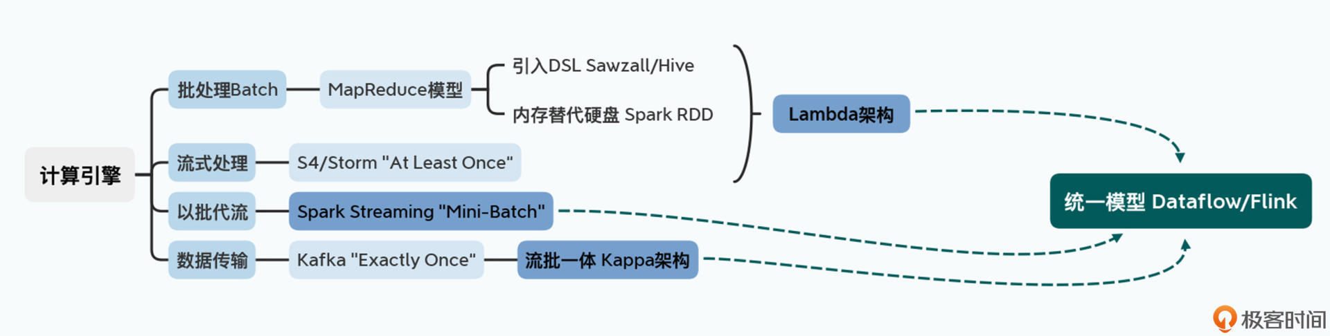 - 我们先有了最原始粗糙的MapReduce来进行批数据处理,然后围绕它不断迭代出了让数据处理更快的Spark和让数据处理更容易的各种DSL(比如Sawzall/Pig和Hive)。