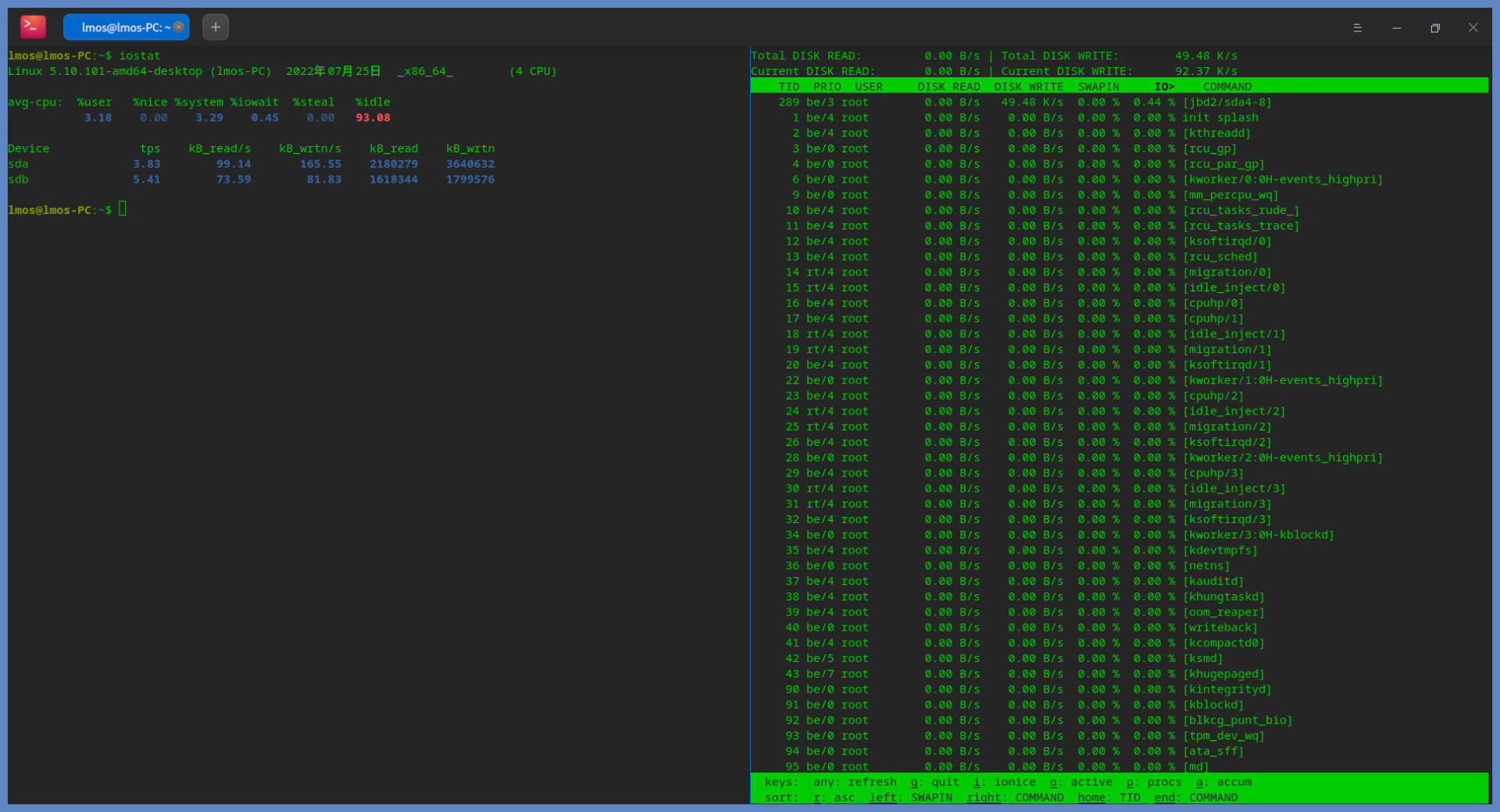 了解了选项,还有个参数我们可能用得上,这个参数可以指定为设备名,比如/dev/sda。如果不带参数,就会默认显示所有IO储存设备的情况。