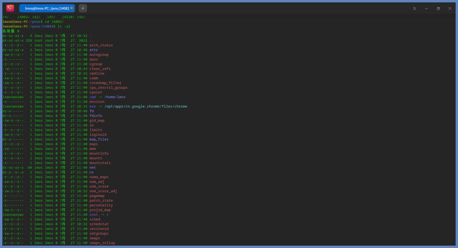 以上代码,无一例外都是从/proc目录下那些数字命名的子目录里获取数据。我们不妨打开proc目录观察一下,并且我们还要选择一个特定的、数字命名的子目录进入,如下所示: