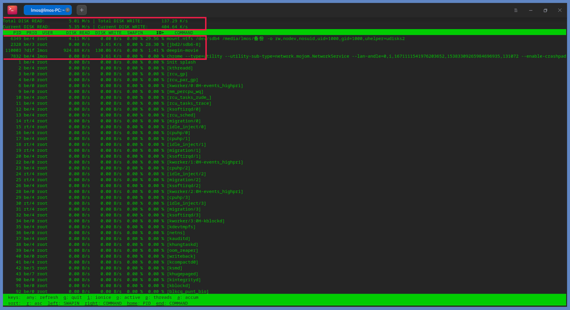 iotop工具是一个用python语言编写的工具,它能监视全局硬盘的IO性能和每个进程的IO情况,是一个全面的IO监视工具。和iostat一样,它也是通过读取/proc目录下每个进程目录中的一些文件,获取其中的数据,再经过计算把数据展示给我们。