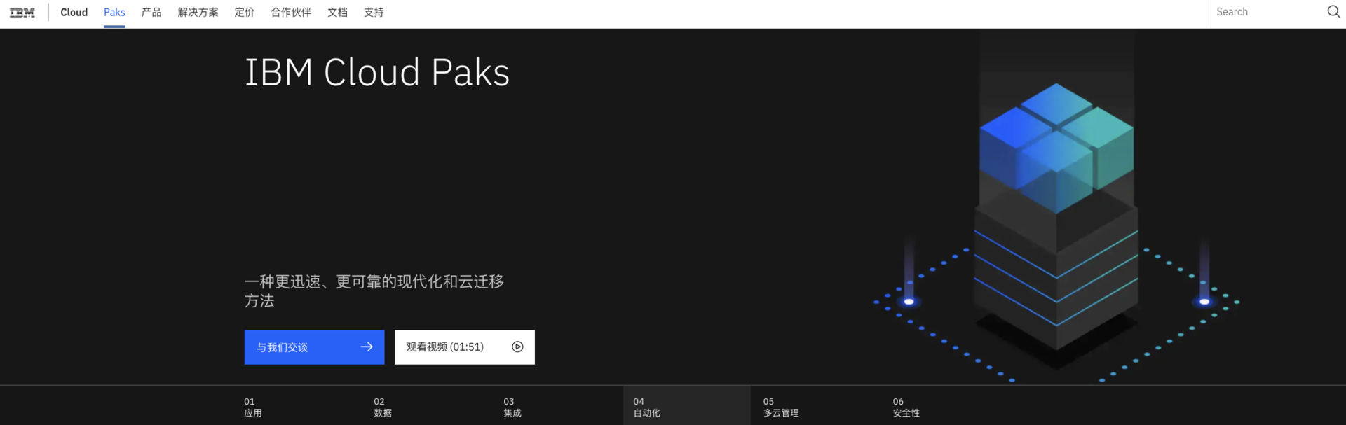这是其企业级全栈式云解决方案——IBM Cloud Paks的首页。我们可以看到,IBM Cloud Paks是一个容器化的解决方案,它的底座象征着云平台本身,而上面的一个个方块则是代表着容器,与底座通过光晕形成一种插接感,体现了容器的灵活性、调度颗粒度,To B的专业用户很容易看出这个极简设计的产品寓意。