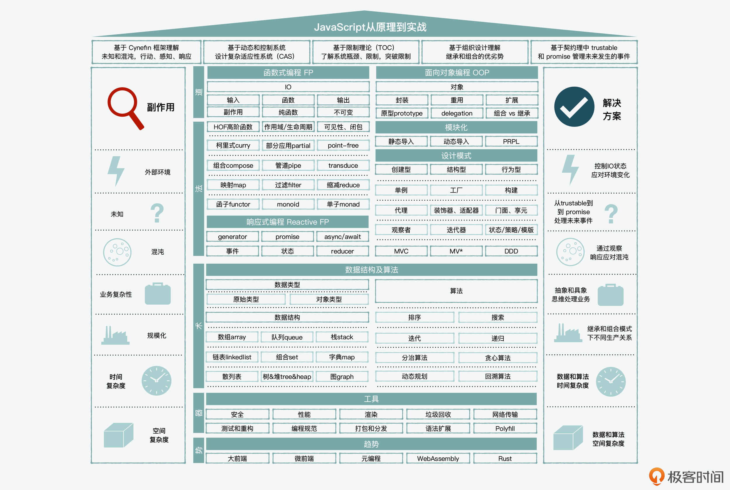第一个模块,我们先来讲讲函数式和面向对象的编程模式,毕竟其中的一些核心概念或**元认知(metacognition)**即使不是恒久不变,也至少是到目前为止,经受住了时间考验的核心理论和实践。因此,当你理解和掌握了这两类核心编程范式之后,你就知道要如何结合JavaScript的特性进行取长补短了,也能够因地制宜地解决实际问题了。